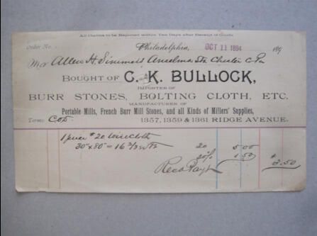 An invoice showing purchase of Bolting Cloth by Allen H. Simmers from C. K Bullock on October 11, 1894.
