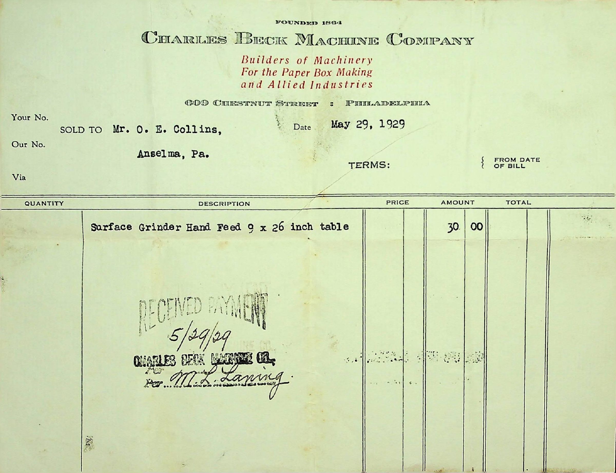 Surface Grinder Hand Feed 9 x 26 inch table sold to O.E. Collins, dated May 29, 1929Dimensions