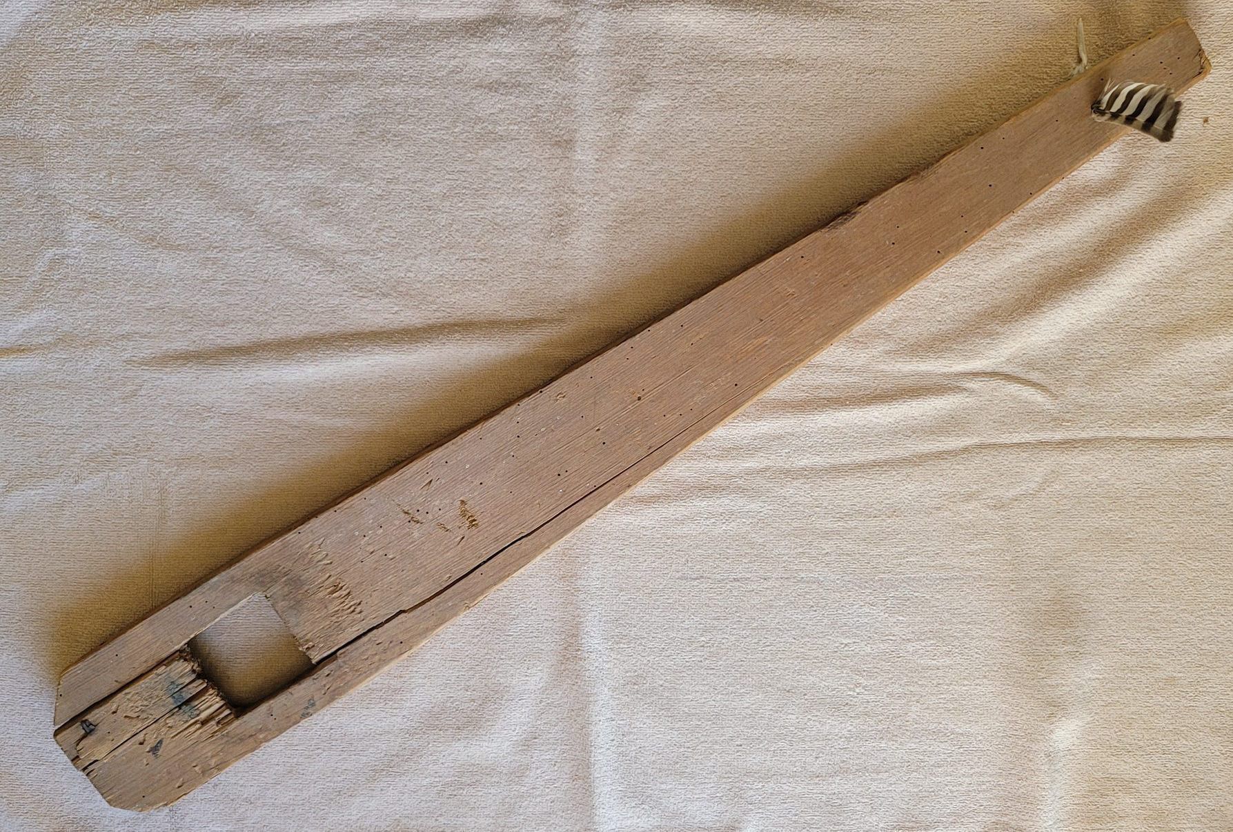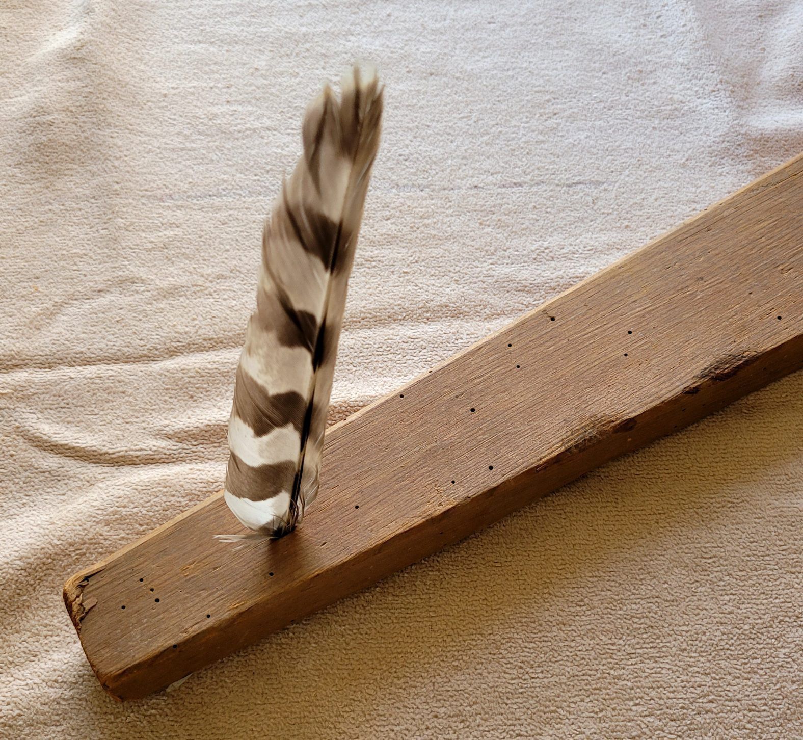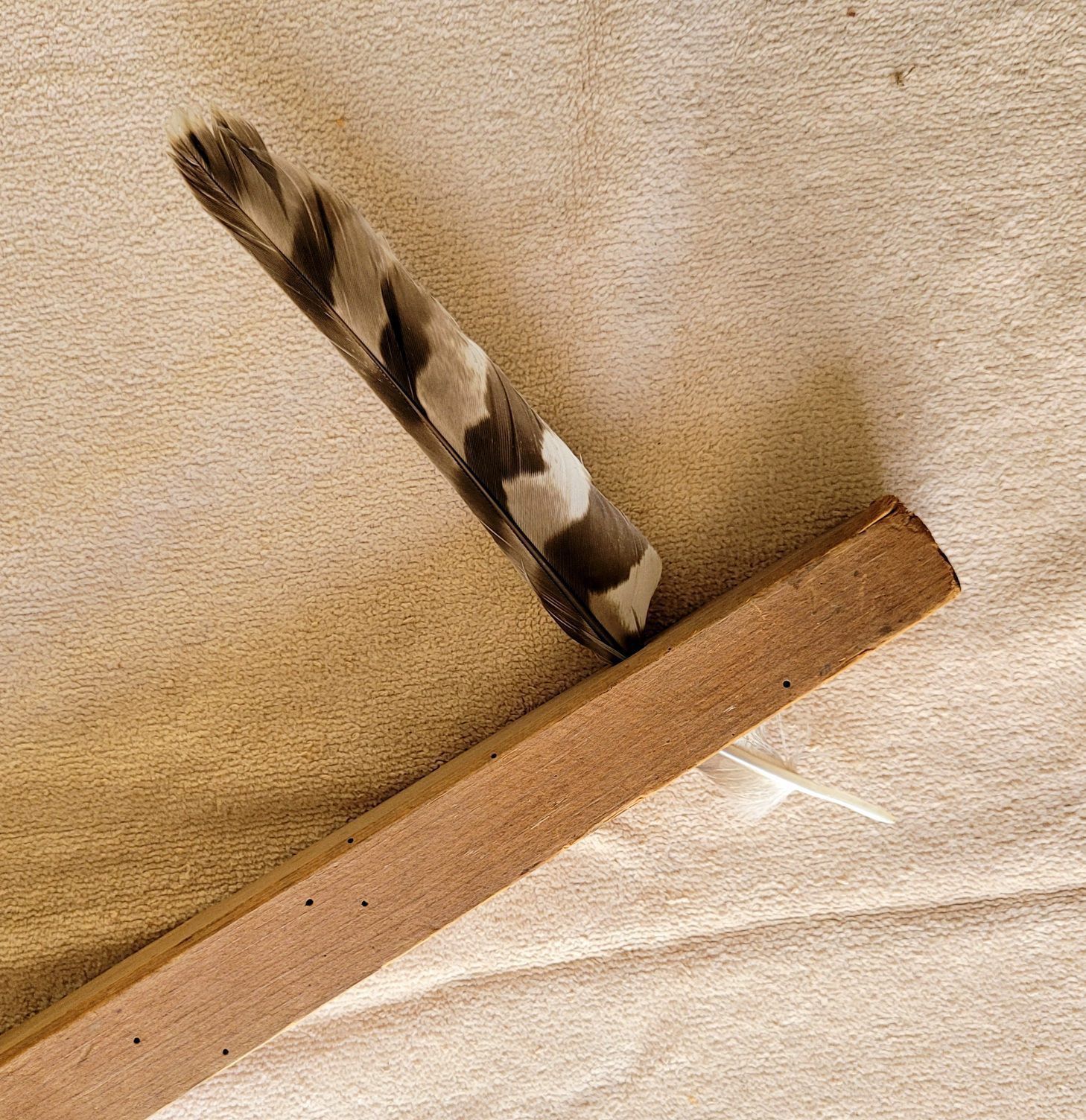 With the Jackstick placed on the spindle, and the spindle and Jackstick are rotated 360° to check that a feather quill protruding thru the Jackstick is consistently the same distance from the bedstone, thus proving the spindle is perpendicular to the bedstone.