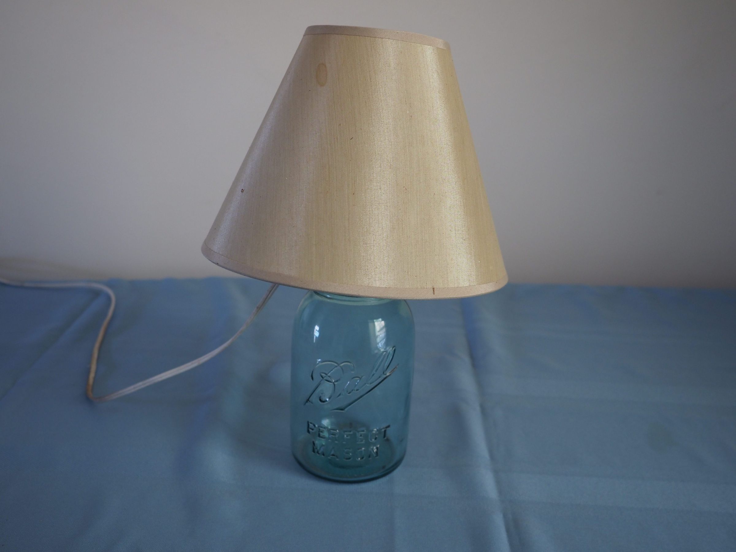 Electric lamp with Ball Perfect Mason jar as base with zinc top, bluish glass and satin shadeMade/Created