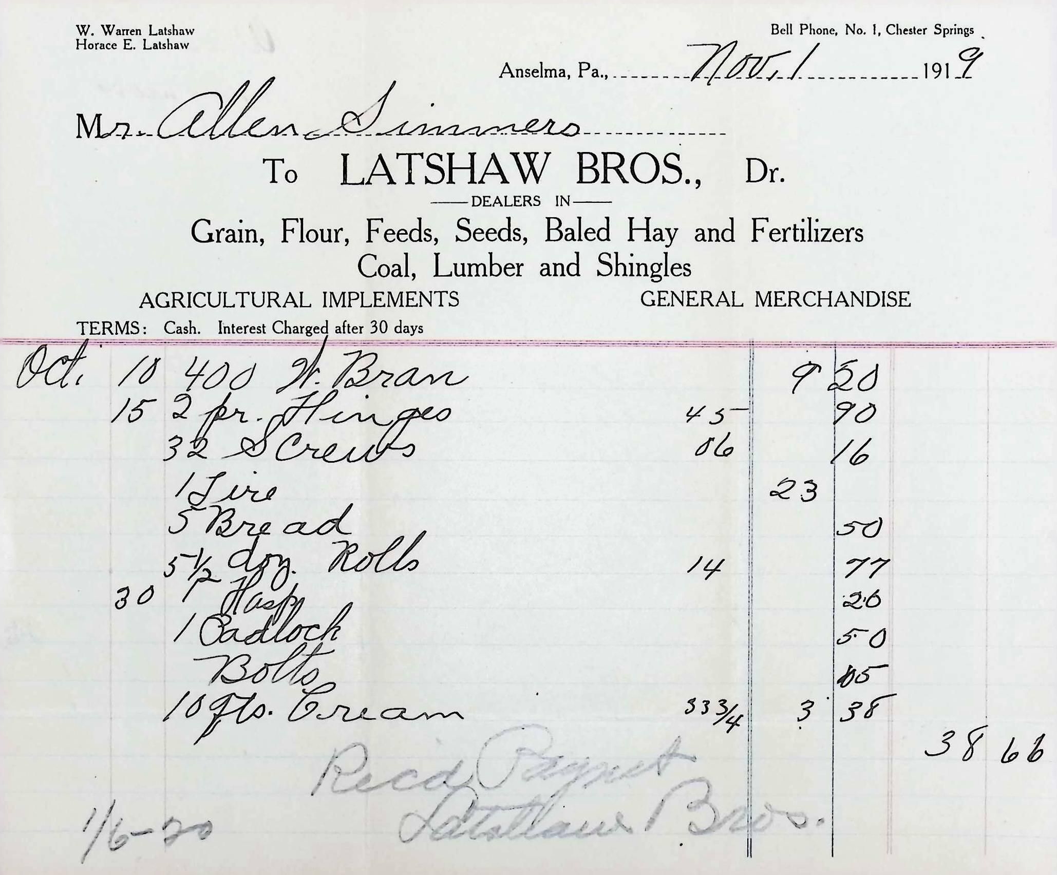 Receipt of payment for invoice dated Nov 1, 1919 for Allen Simmers to Latshaw Bros. January 6, 1920, for the amount of $38.66.