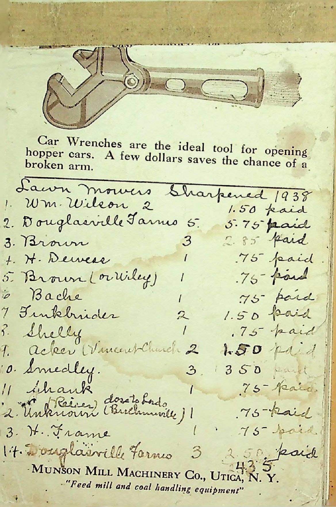 Note Pad Listing Lawn Mowers Sharpened by O.E.C. in 1938 with Clients and Prices