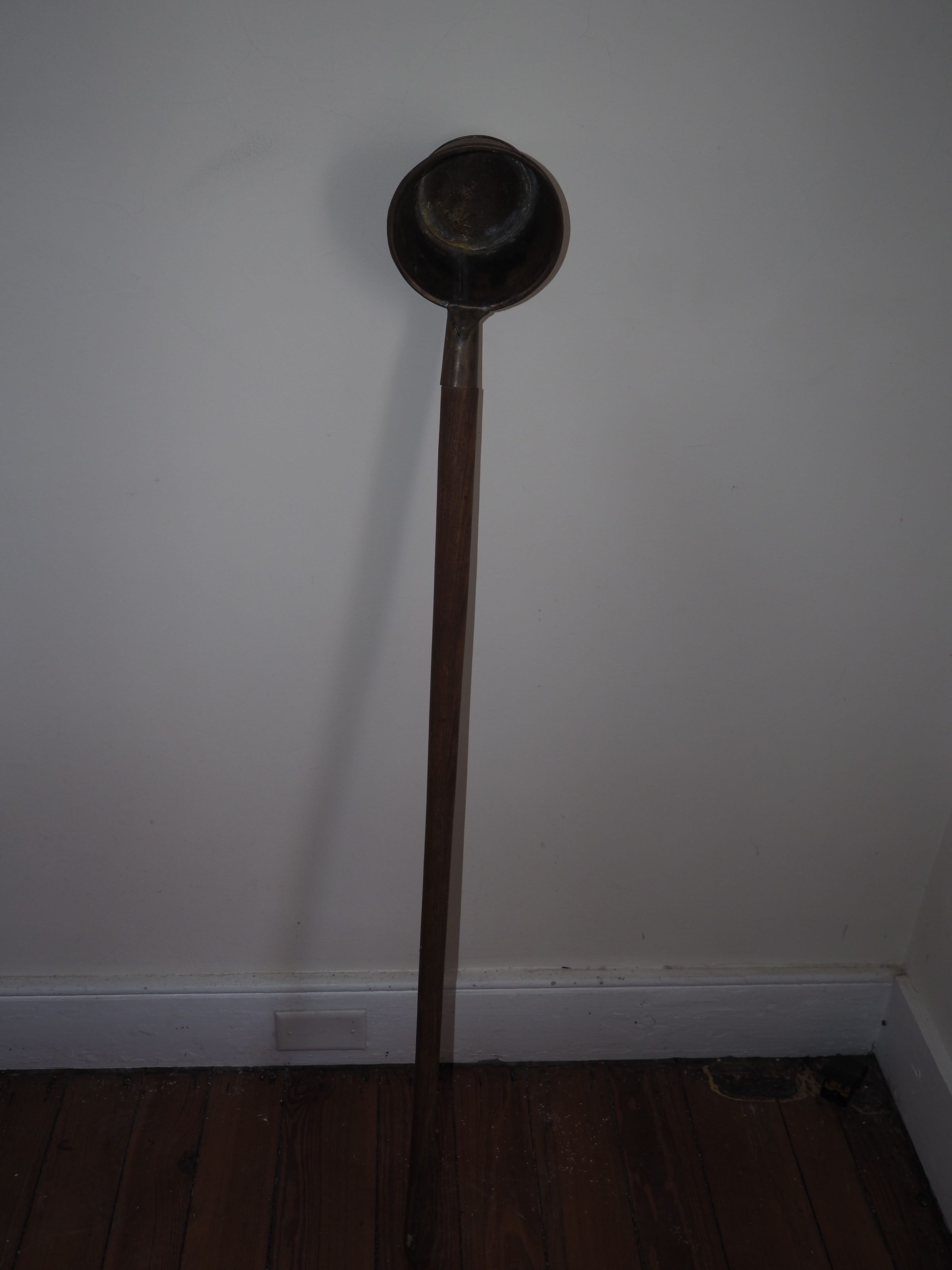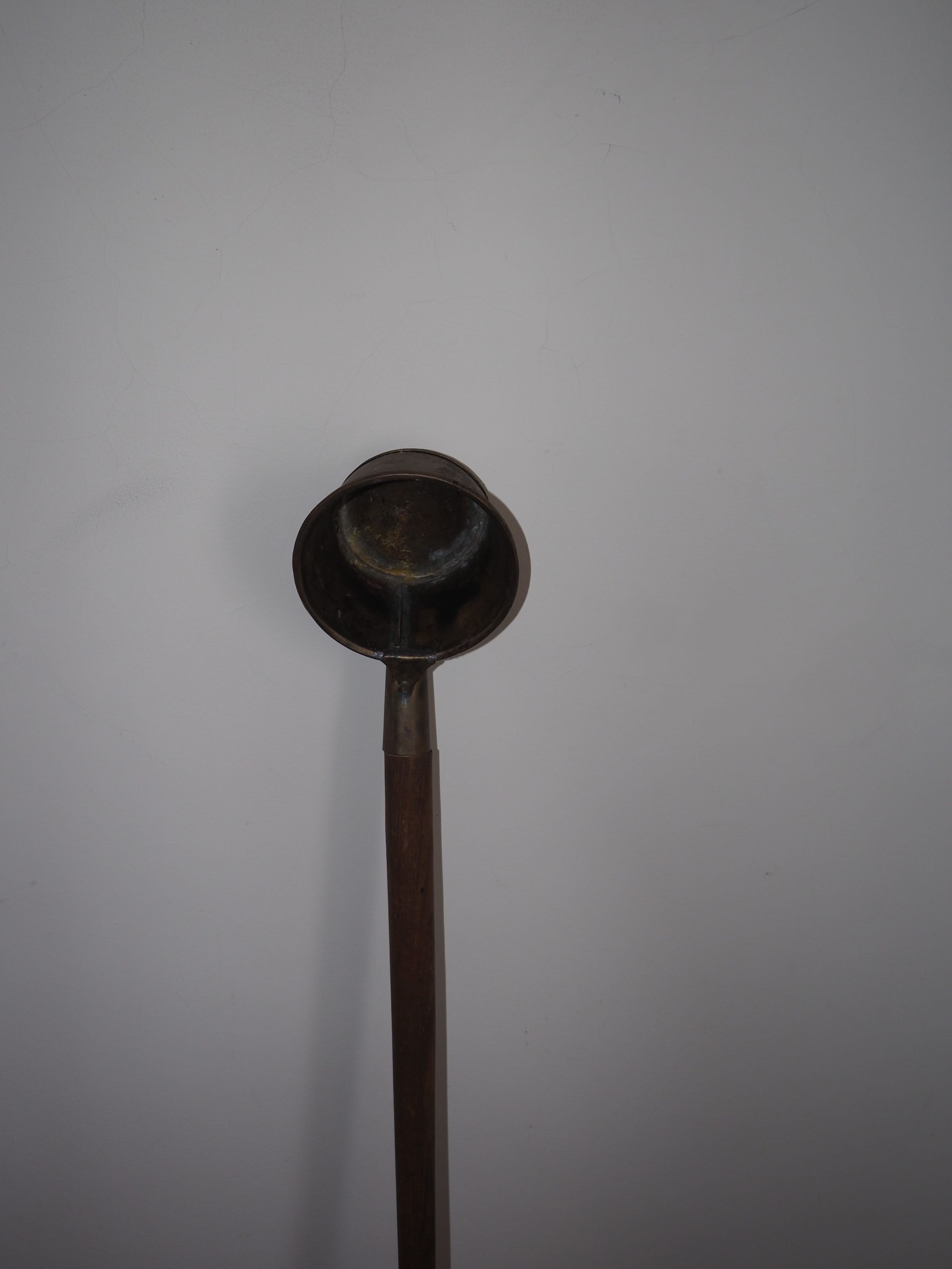 Long handled ladle, handmade with brass roll top rim and wooden handle
