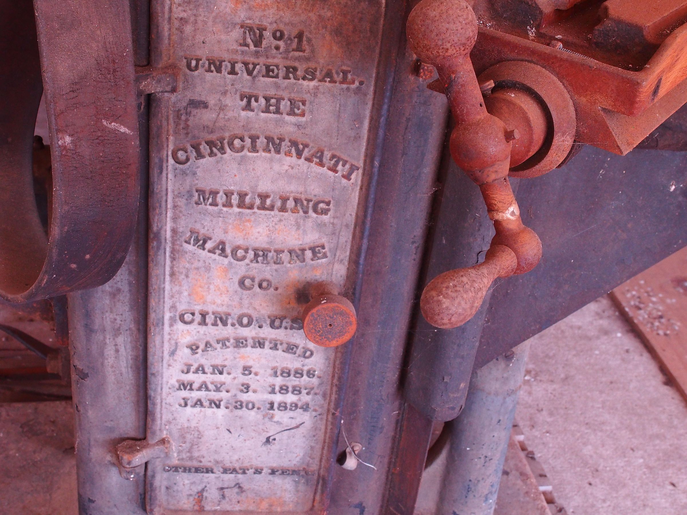 This machine is designated "Cincinnati No. 1 Universal Milling Machine". Although intended for machining metal, it has a vertical milling attachment used for milling wood. This machine was purchased used from the Charles Boon Paper Machine Co. Chestnut St Philadelphia, PA for $30.