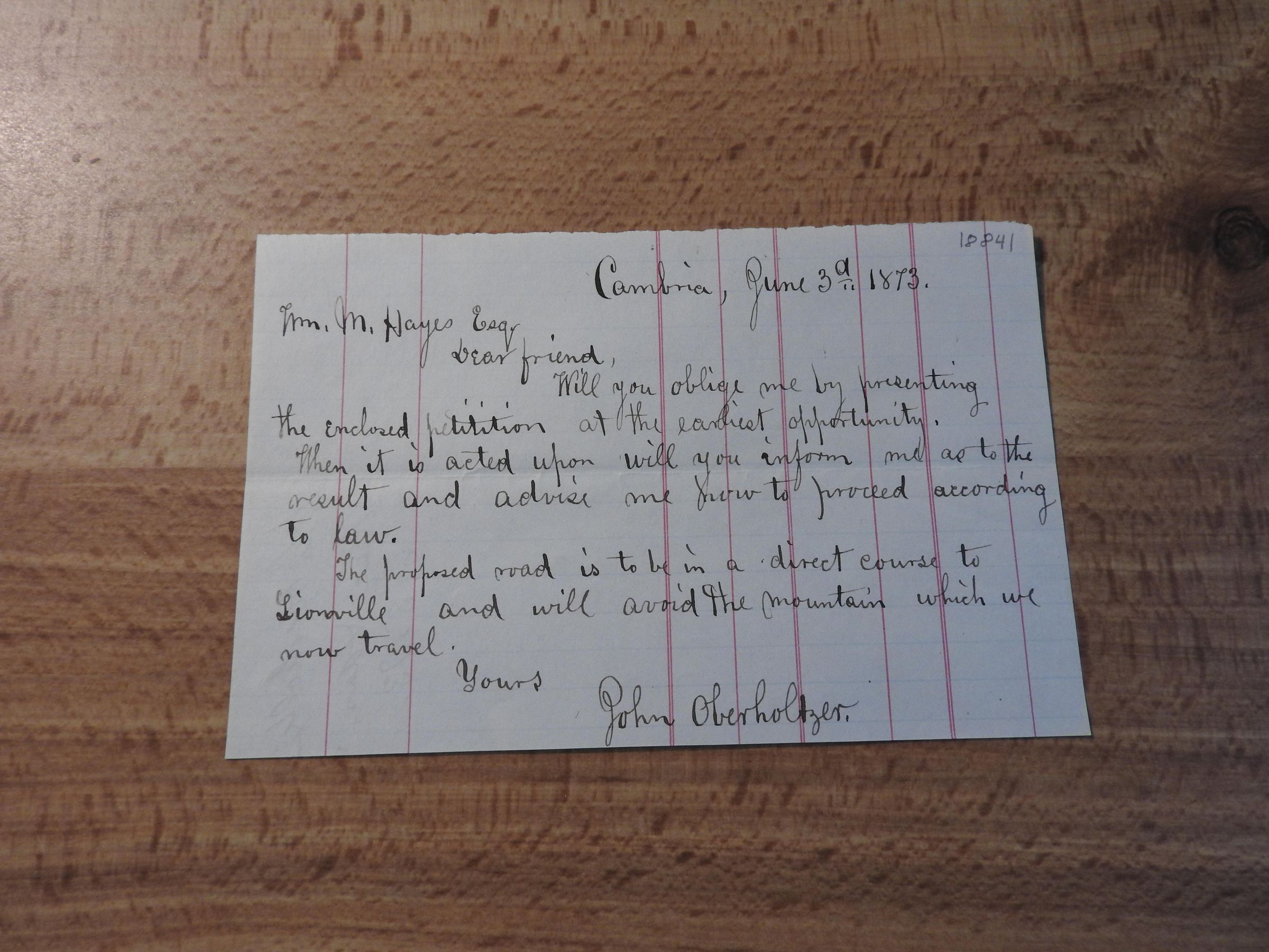 Photograph of a Note written June 3rd, 1873 by John Oberholtzer to Wm. M. Hayes, Esq.Context