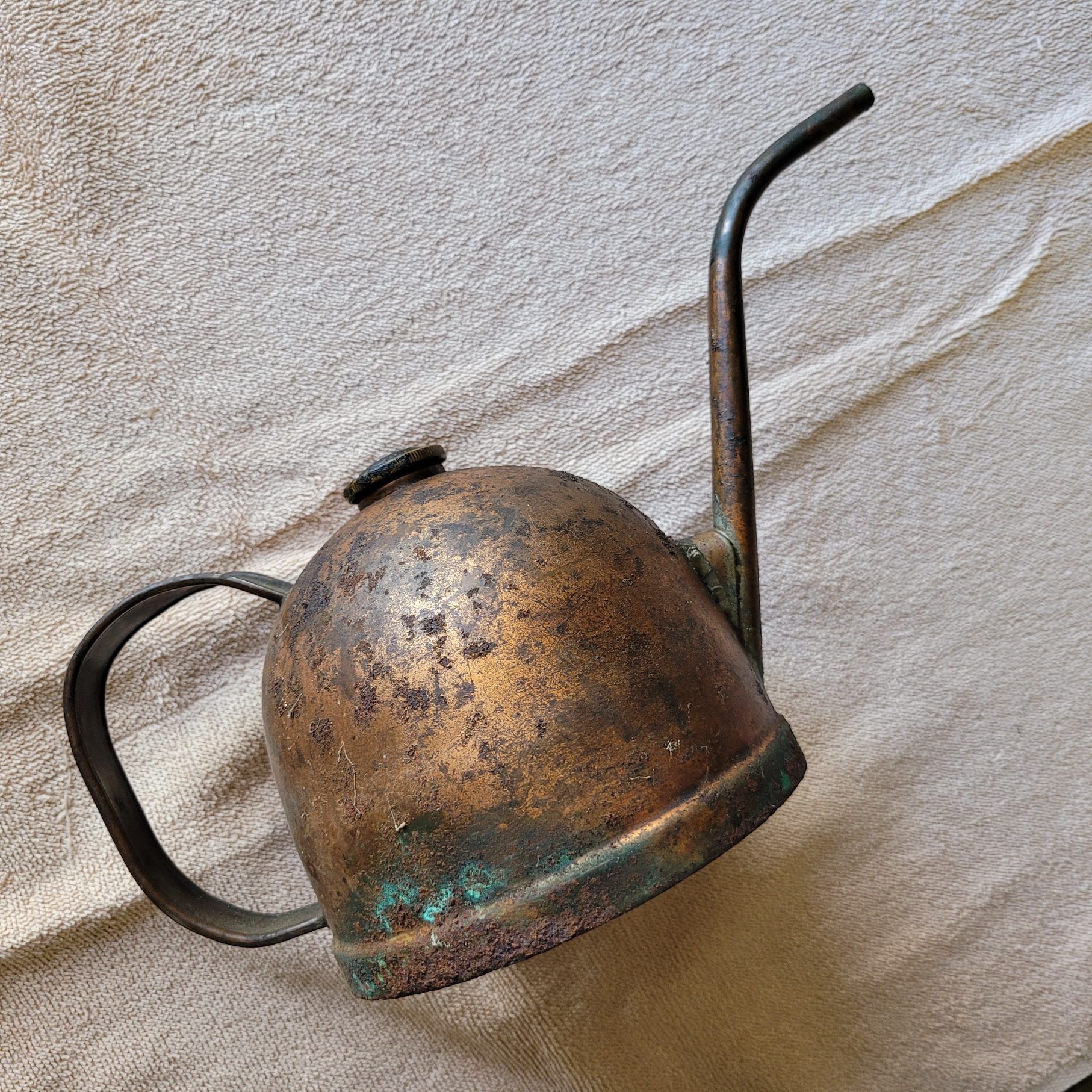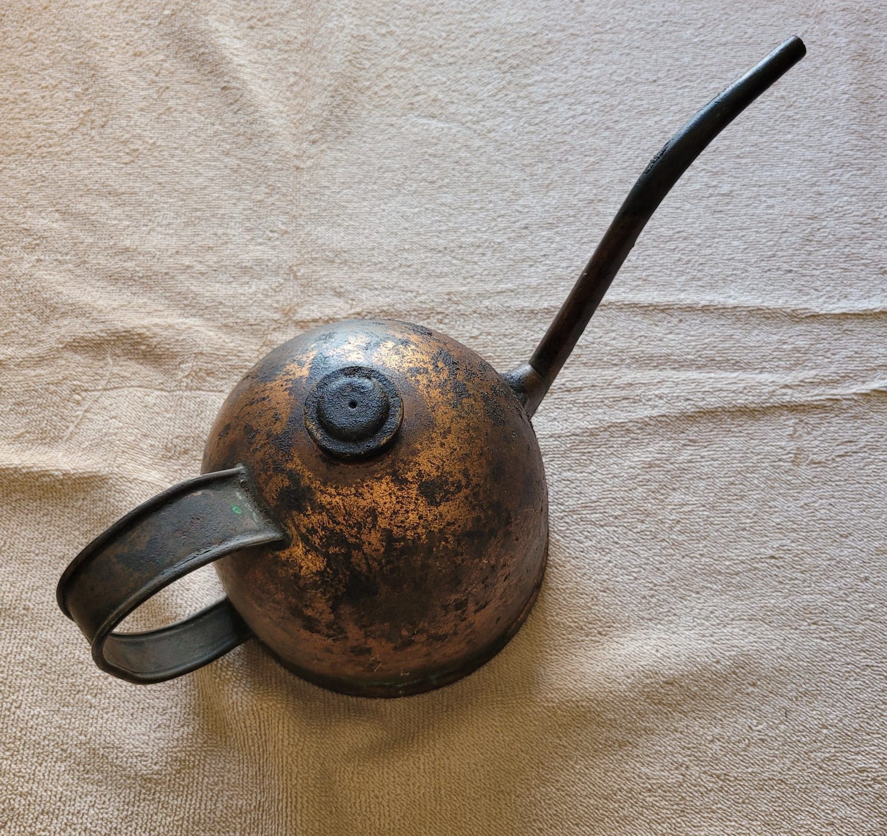 Oil can, metal with handle and spout, contains some oilDimensions