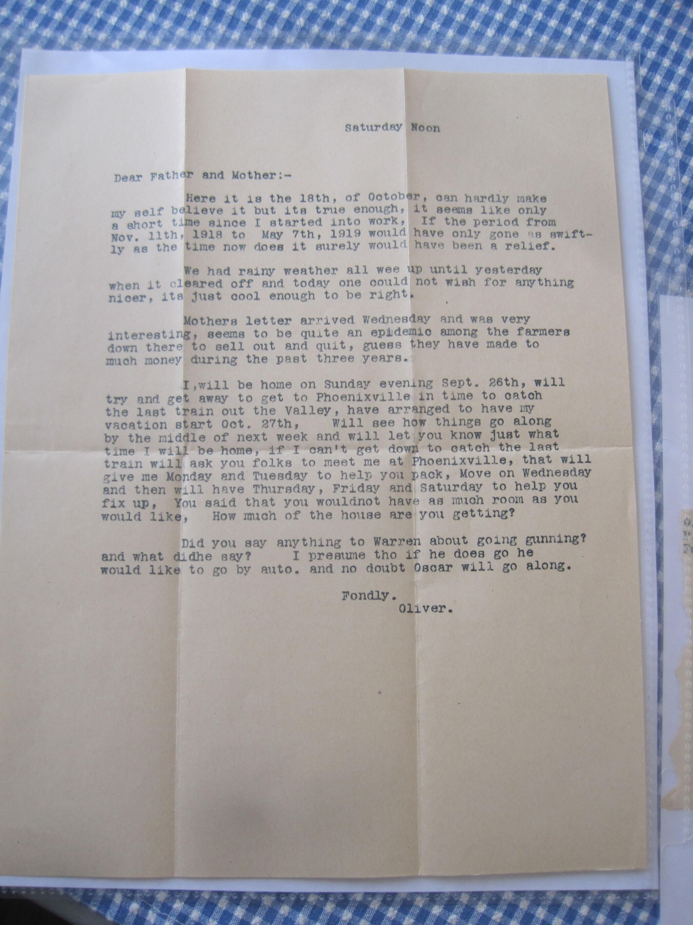 Letter to Allen and Annie Simmers from their son Oliver. Written October