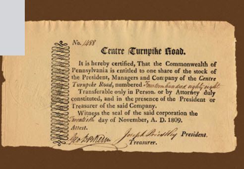 One share certificate in the Centre Turnpike Road of 1809