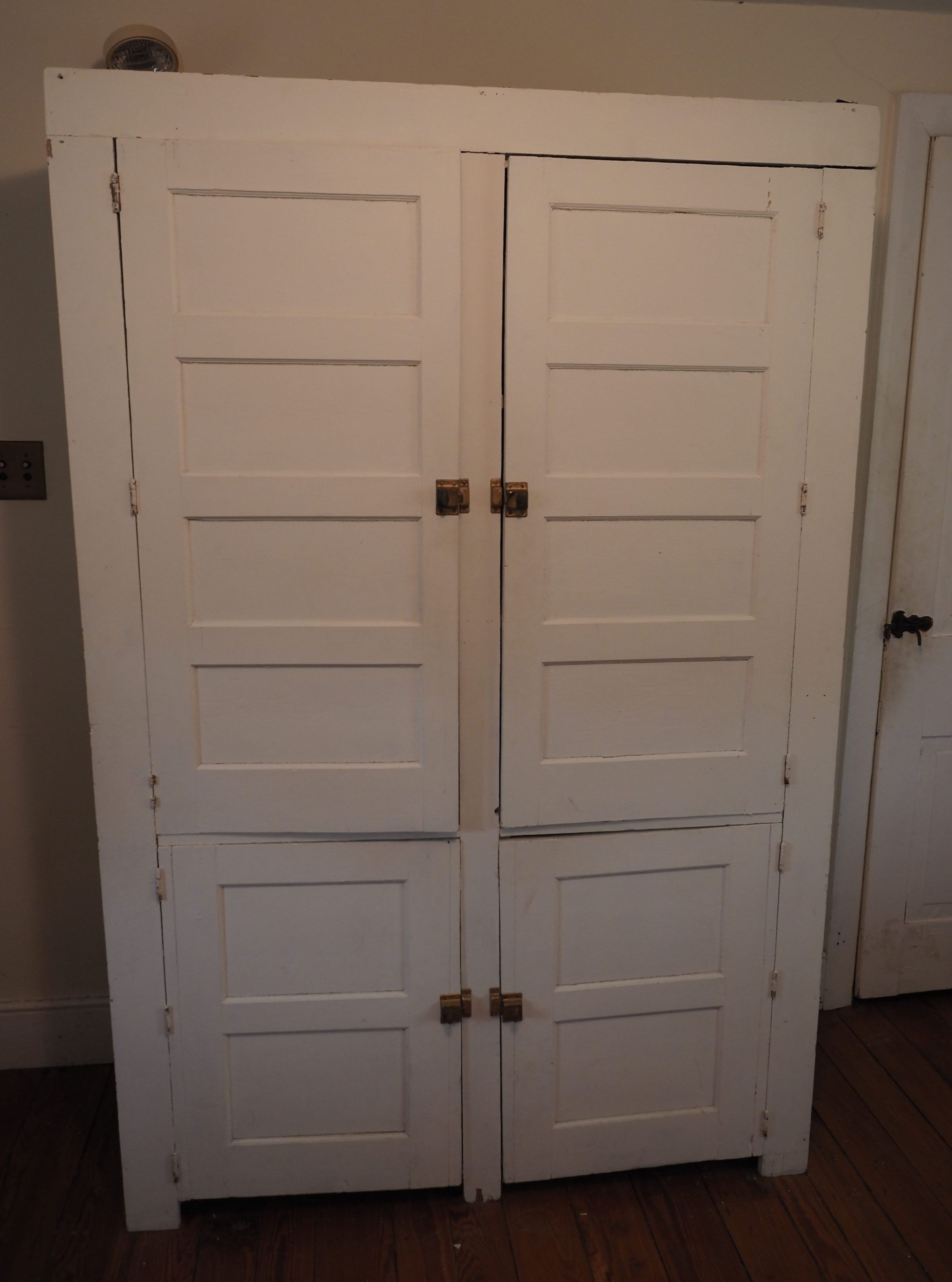 Pantry cabinet, painted white, flat panel doors, bead board back, six shelvesDimensions