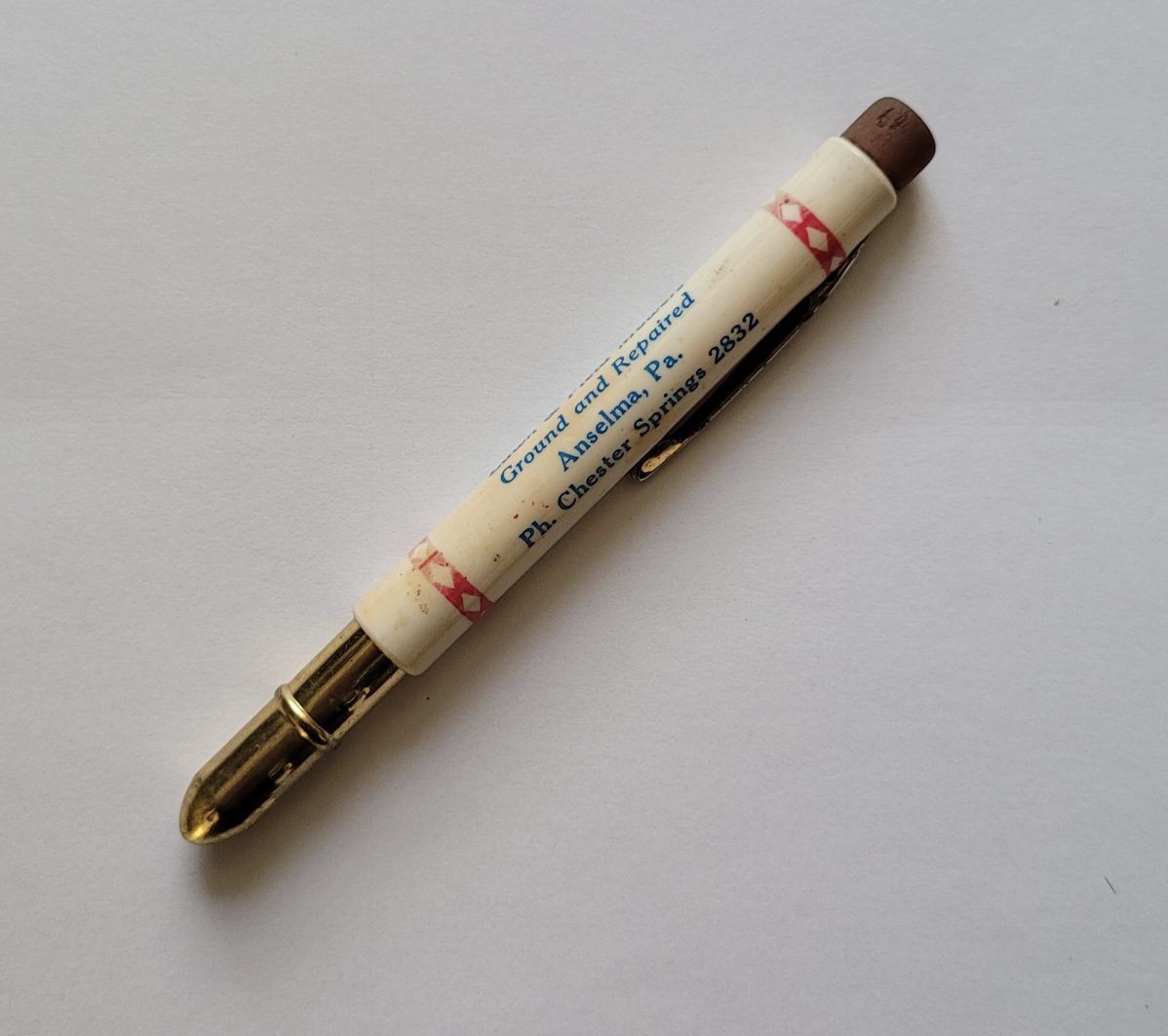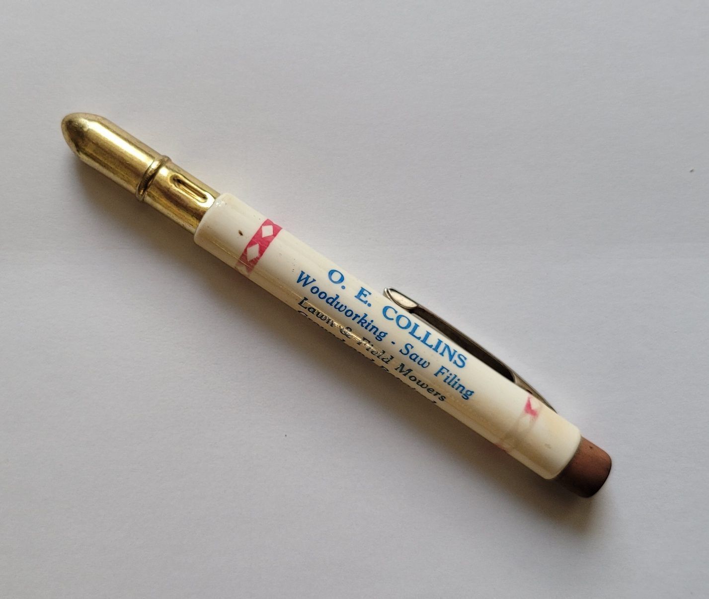 Two piece pencil (2 of 2) - white holder with lettering and eraser and pocket clip; red pencil with brass holderInscription/Signature/Marks