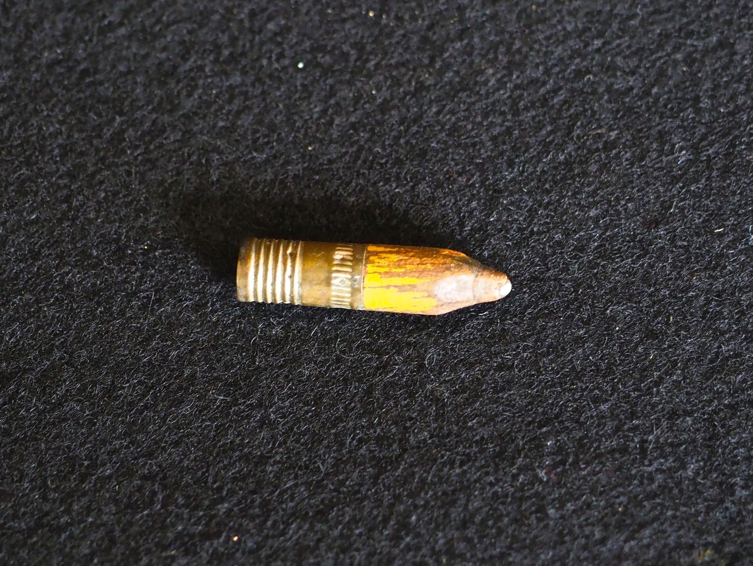 Pencil Stub - worn yellow pencil shaft with metal collar; no eraser, sharpened tip