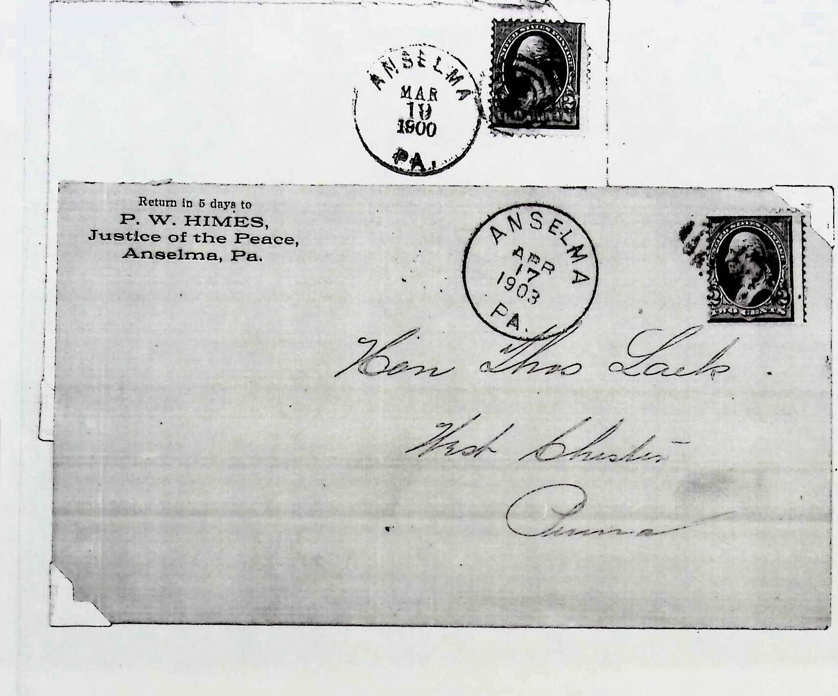 Photocopy of Envelope Addressed to Hon Thos Lark from P W Himes Justice of the Peace Anselma. Dated April 17,1903 also Postmark from Mar 19,1900.