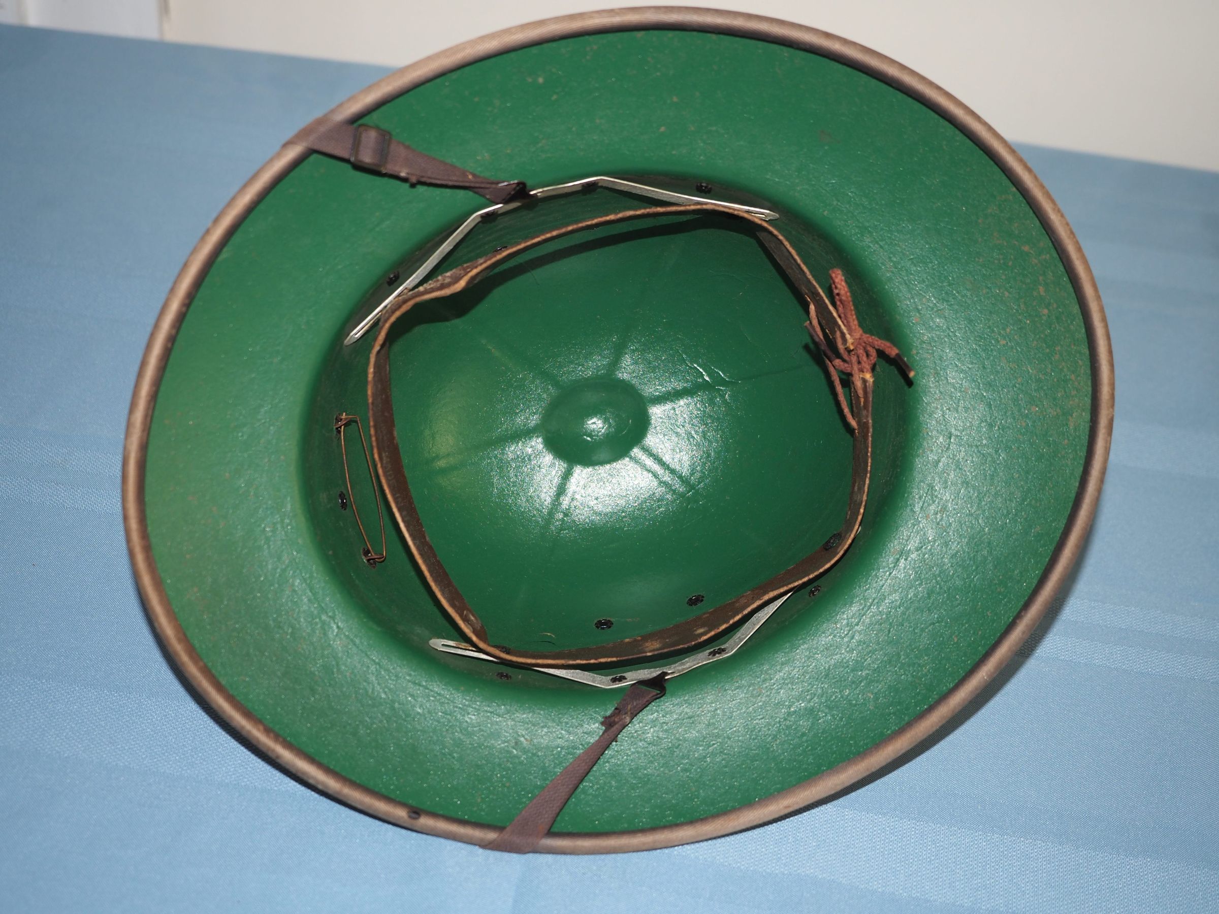 Hard hat with leather strap; tan fabric over plastic, green insideLabel/Inscription/Signature