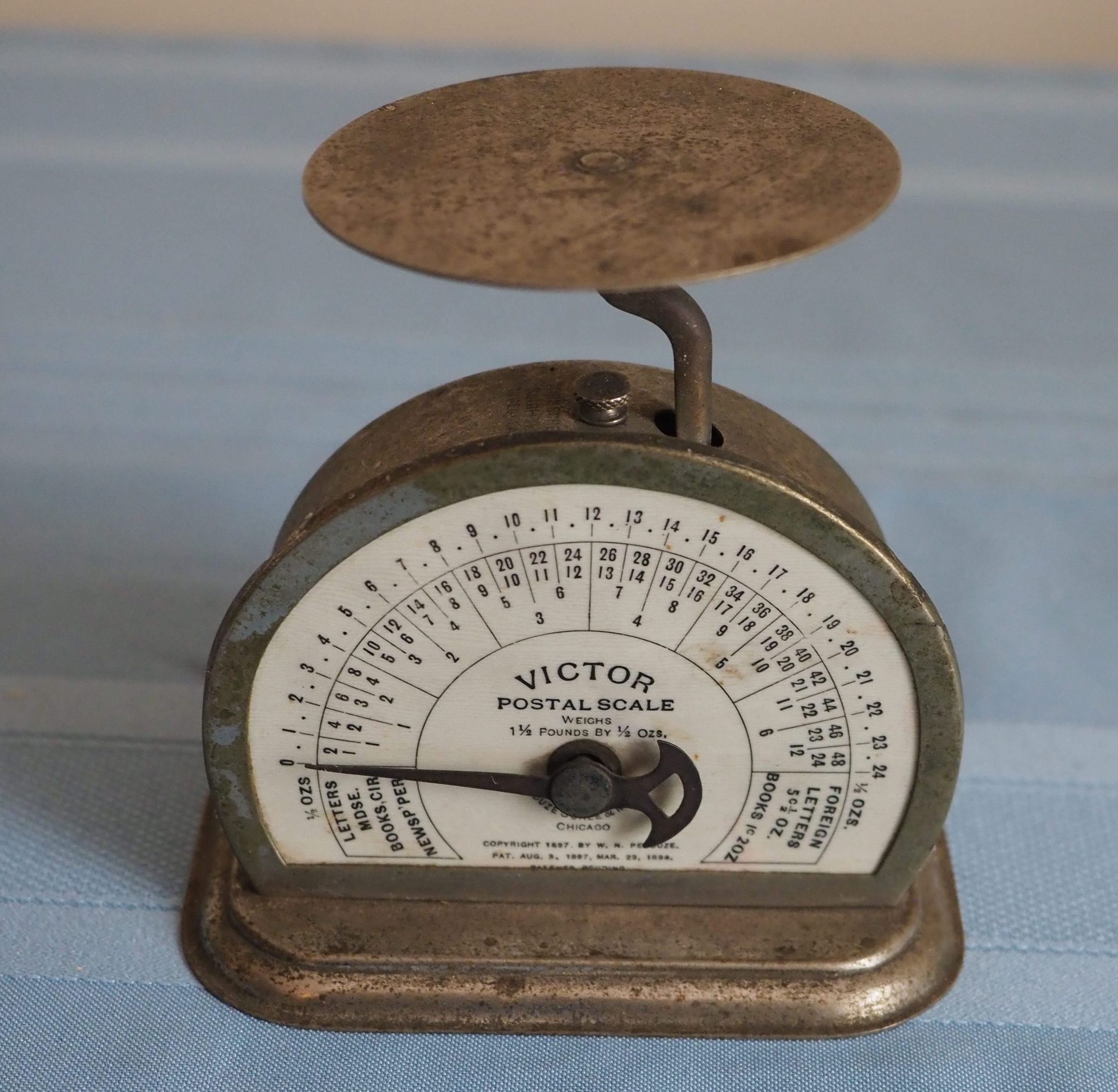 Postal scale with round top, weights up to 1-1/2 lbs by 1/2 ounceMade/Created