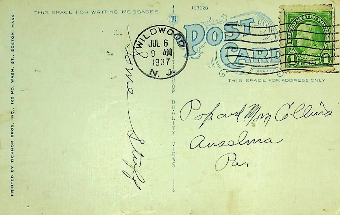 Postcard sent to O.E. Collins from Wildwood, NJ 7/6/1937