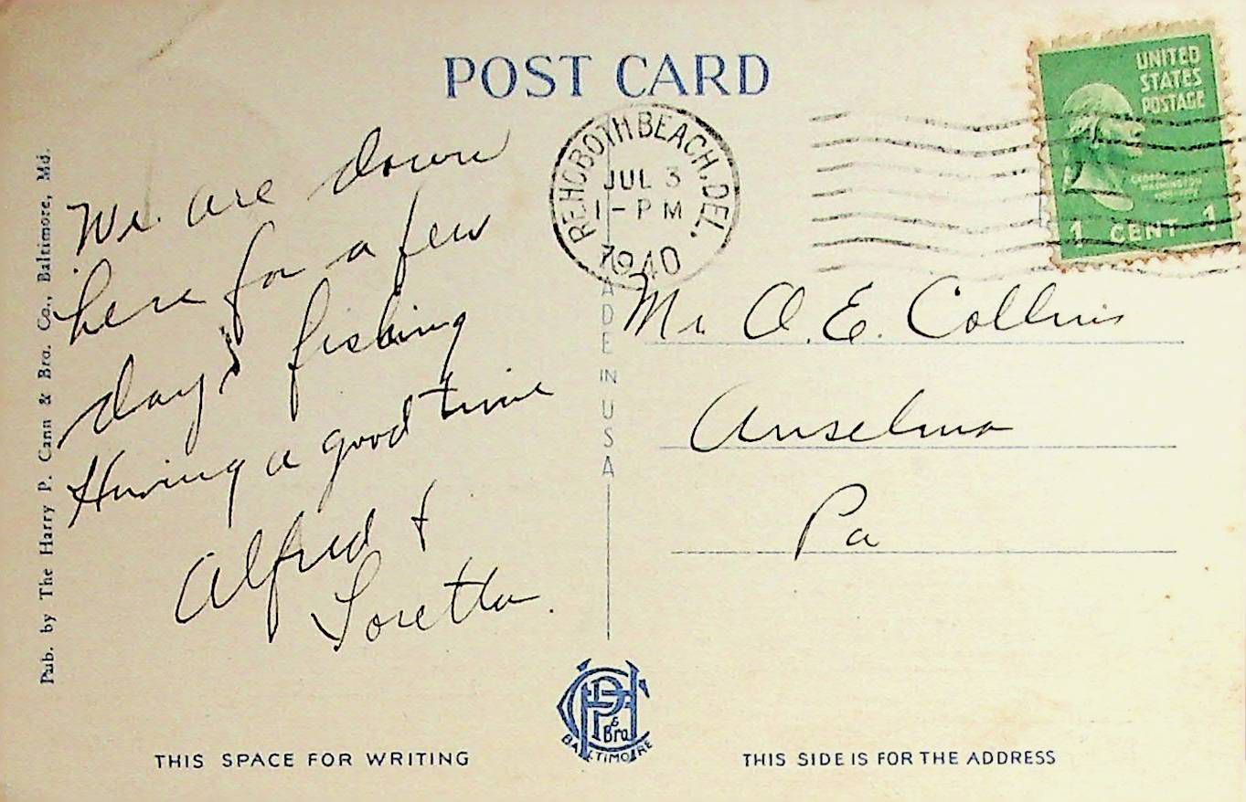 Postcard sent to O.E> Collins from Rehoboth Beach, DE, postmarked July 3, 1940