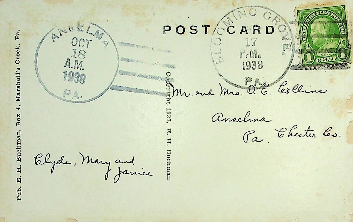 Postcard sent to O.E. Collins from Anselma PA 10/18/1938
