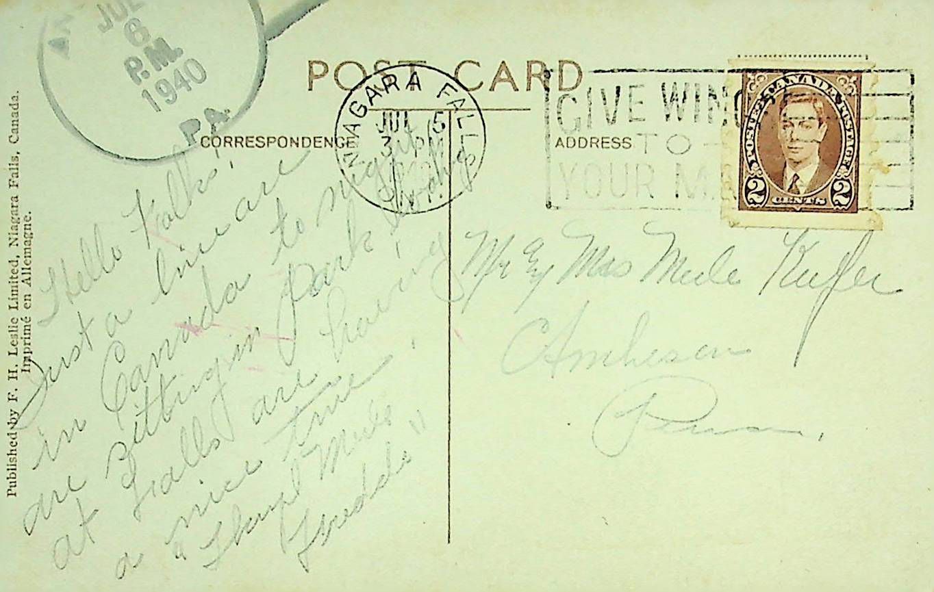 Postcard sent to Mr. and Mrs. Keefer 7/6/1940 from Niagara Falls, NY
