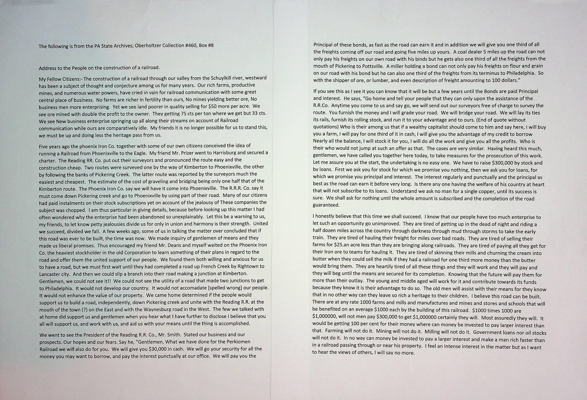 Minutes of meeting of concerned citizens in 1868 in which John Oberholtzer proposes the construction of PVRR