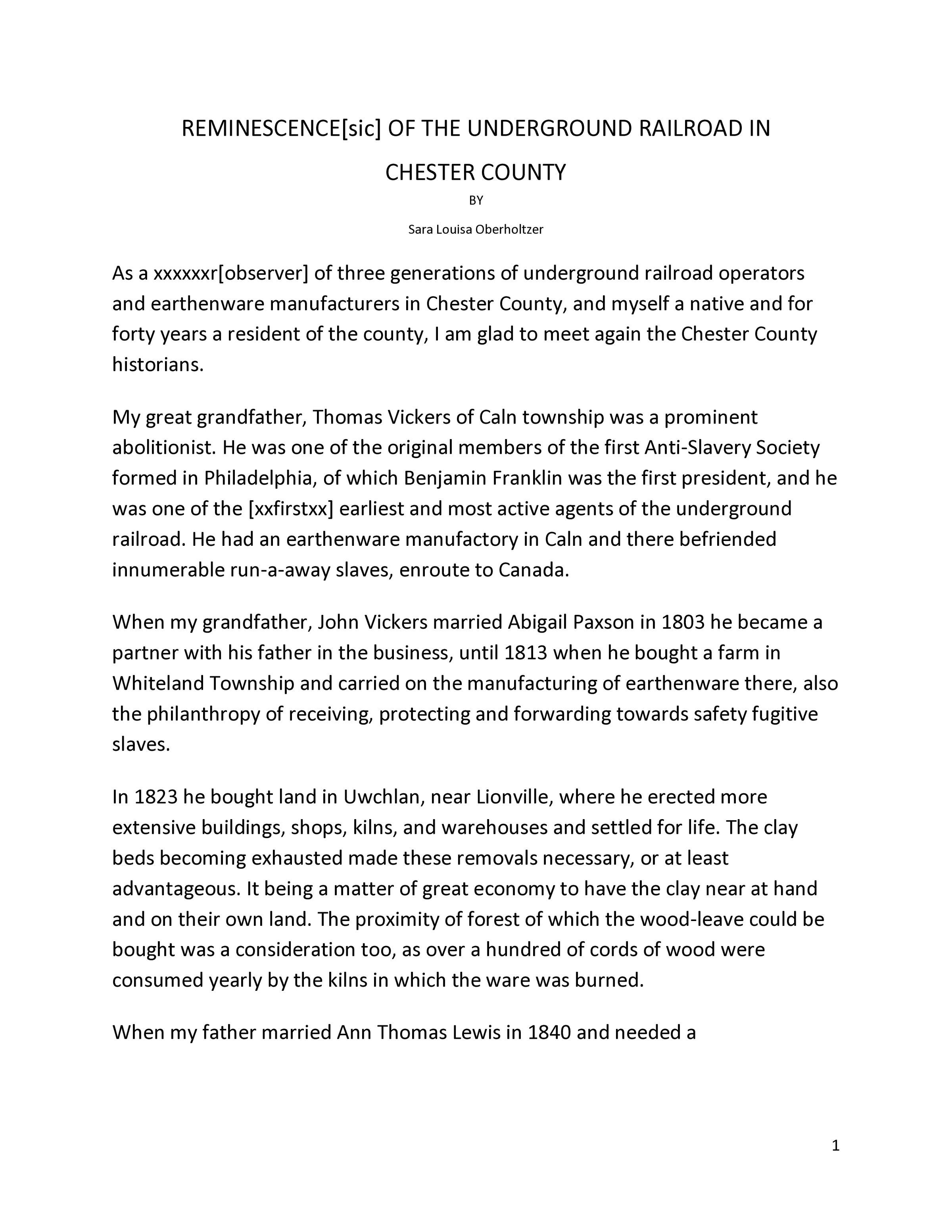 Transcribed from a copy of talk given by Sara Louisa Oberholtzer to the Chester County HistoriansContext
