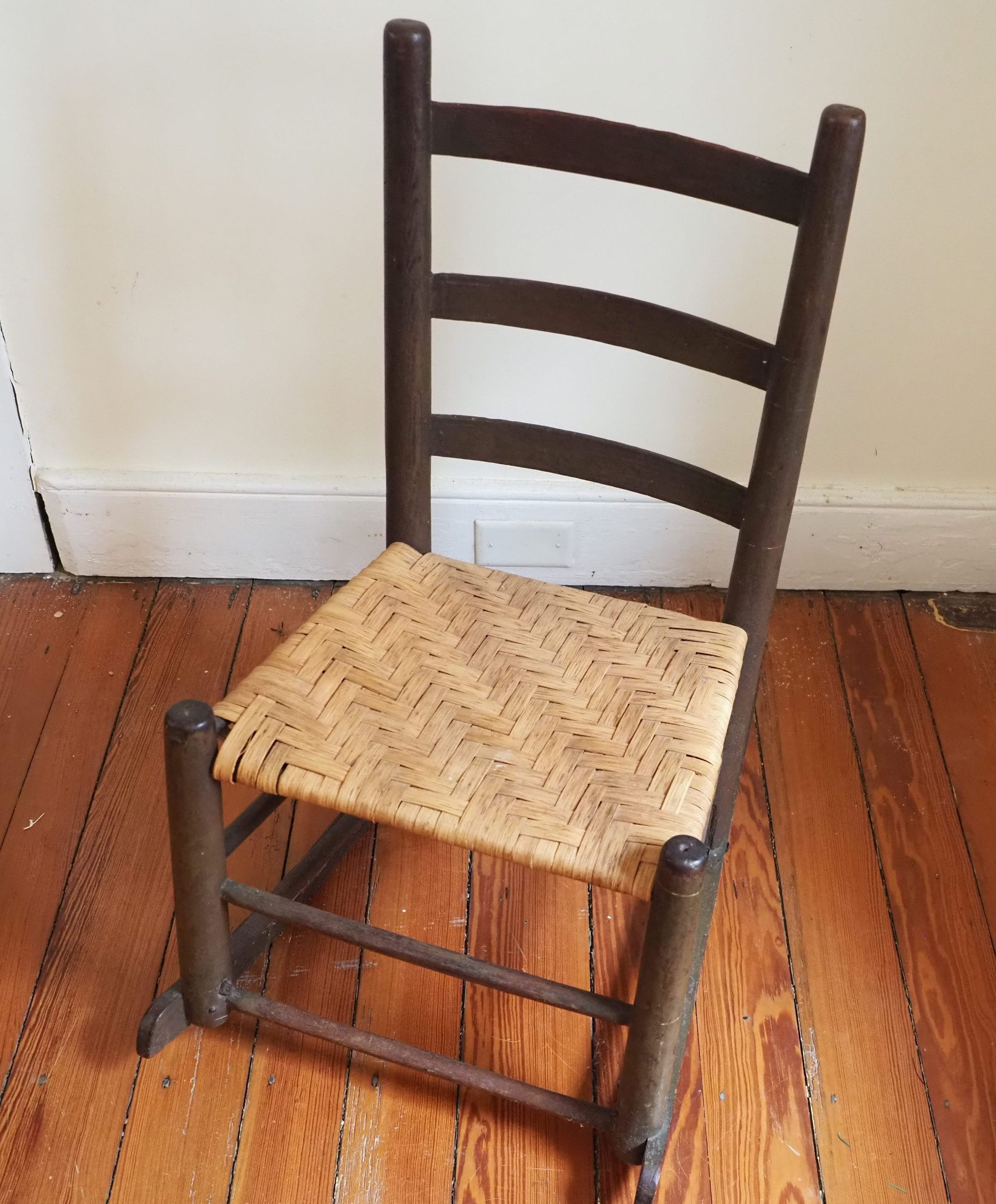 Ladder back rocking chair, wood with hickory slat woven seat