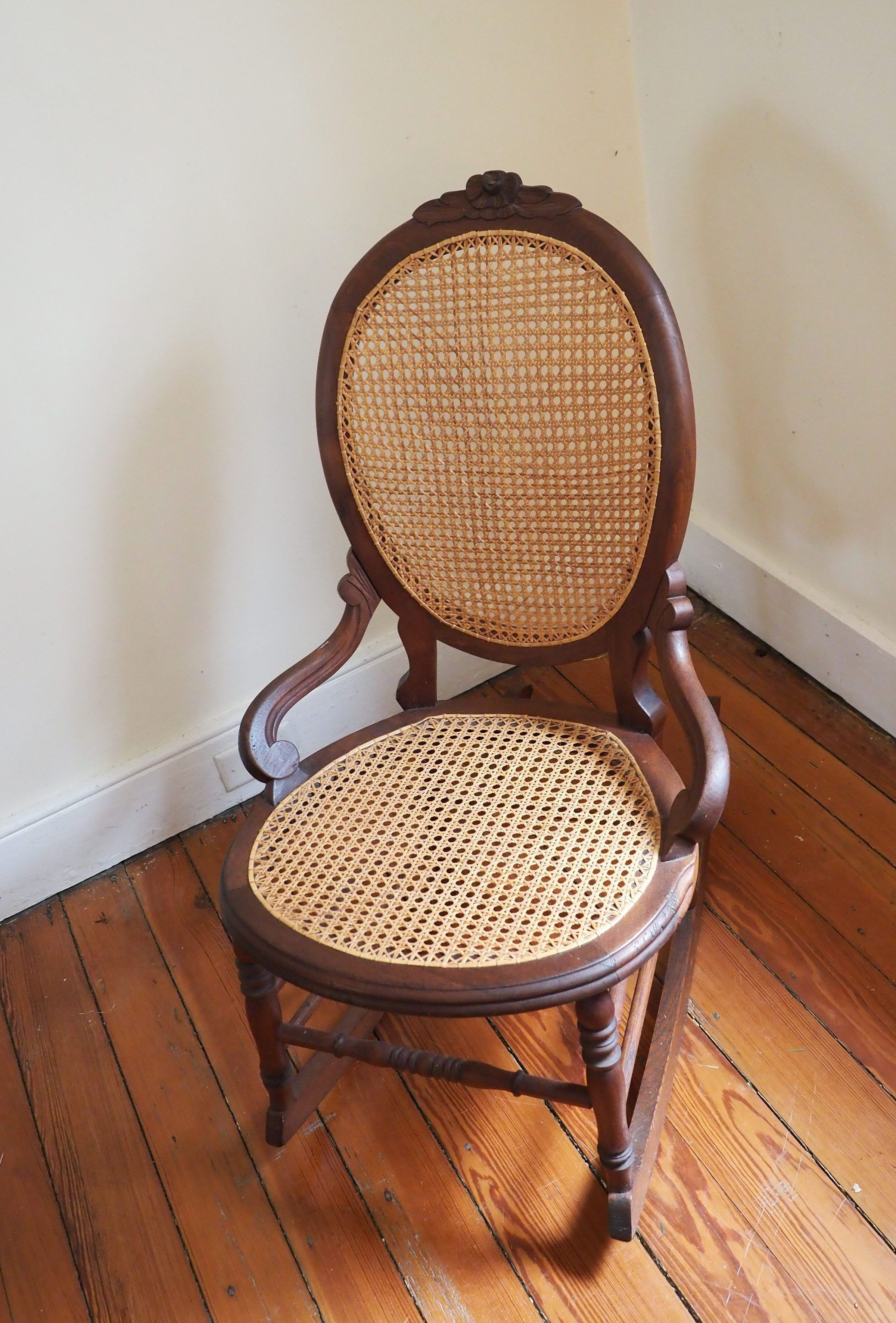 Oval rocking chair with caned seat and back, scrolled arms