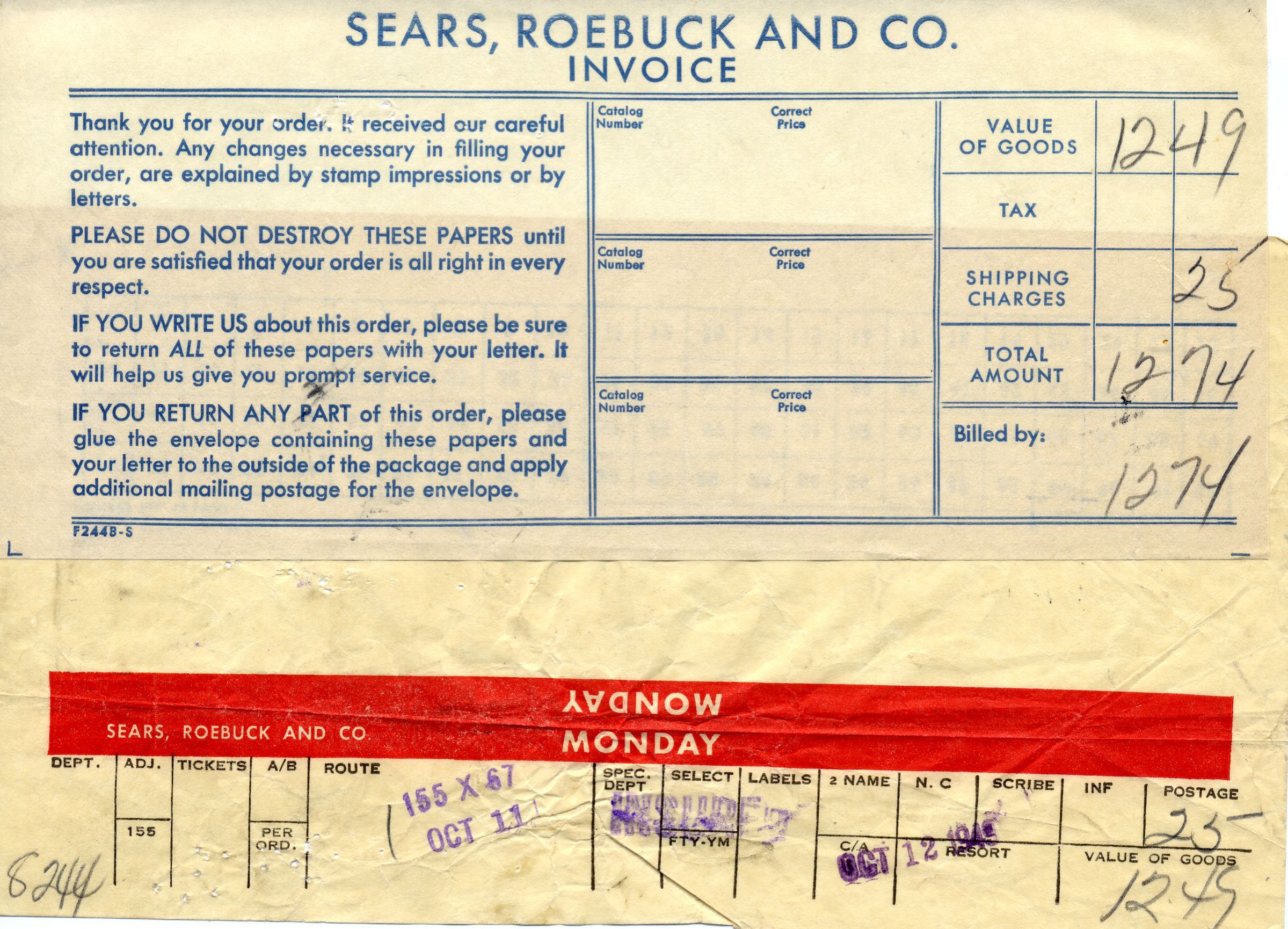 Invoices 10/12/49 from Sears Roebuck found in Collins day book feed grinding. 1927-43.