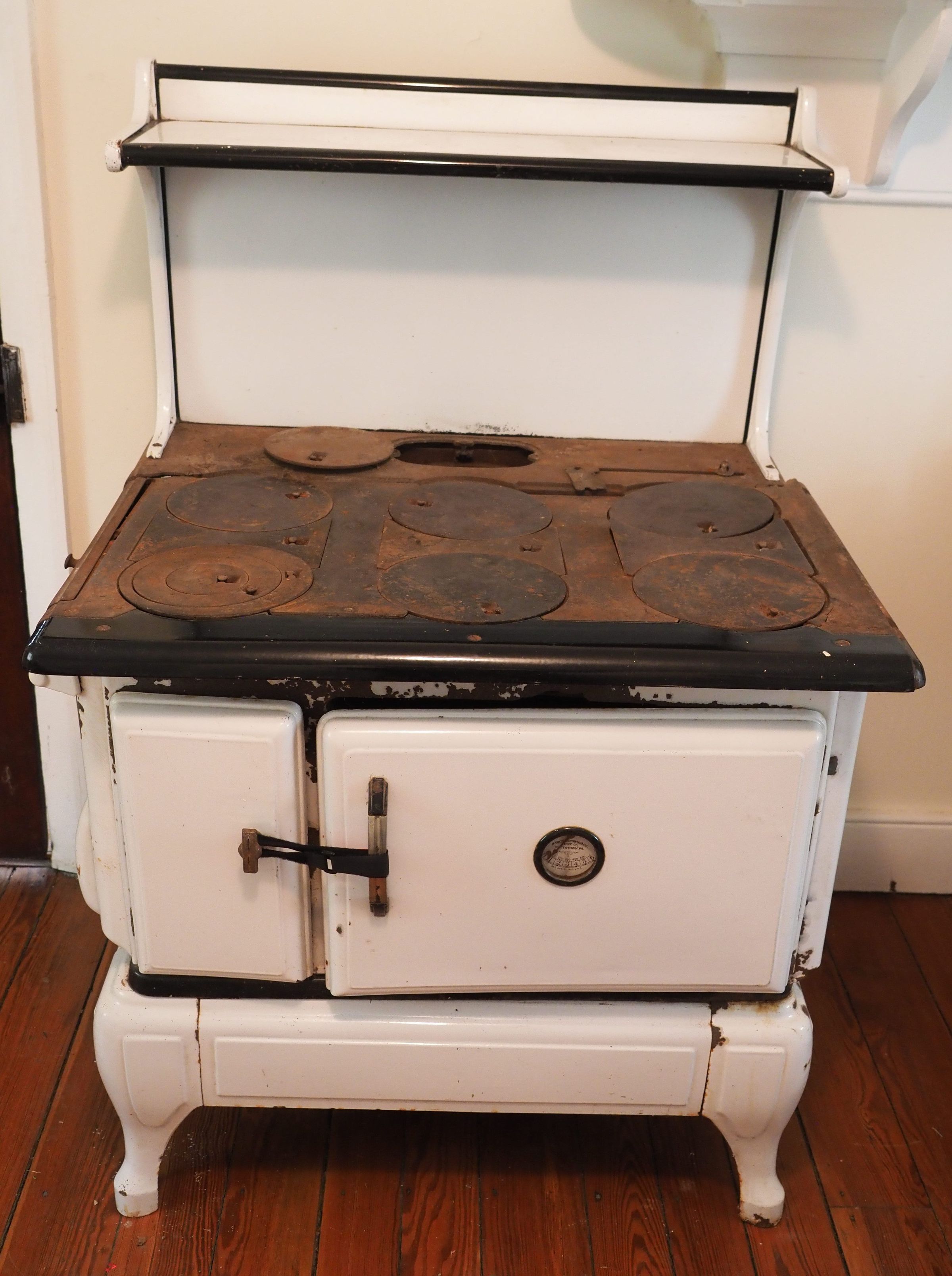 Six burner stove, 2 door - ash door on left, oven on right, cast iron with white and black enamel, backsplash with shelfMade/Created