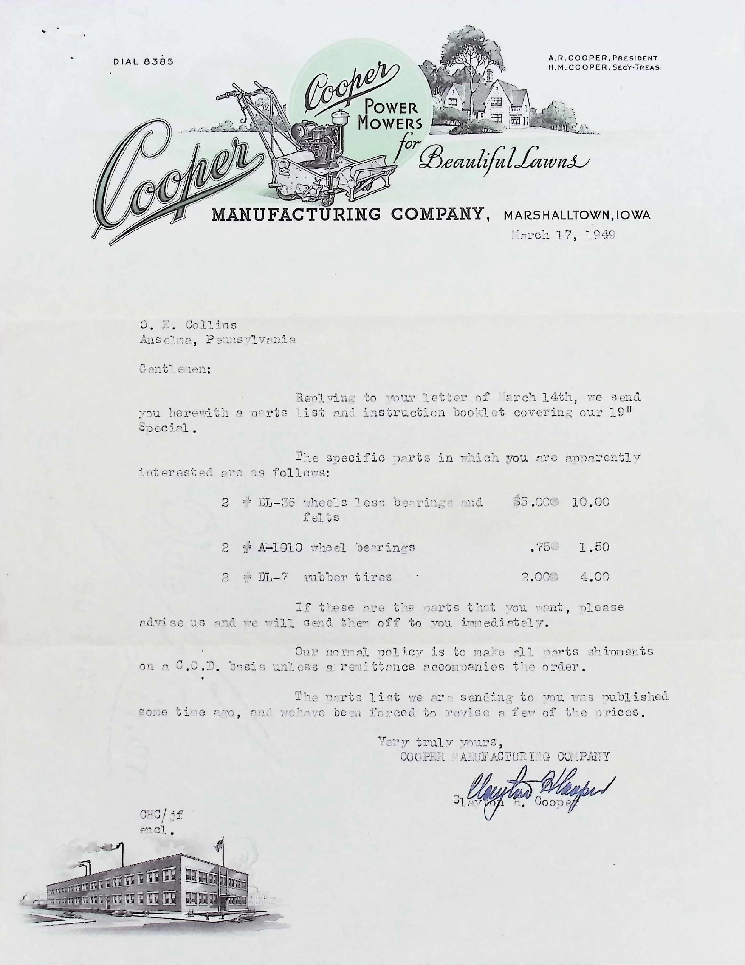 One of three Letters from Cooper Power Mowers Manufacturing Co.+brochures
