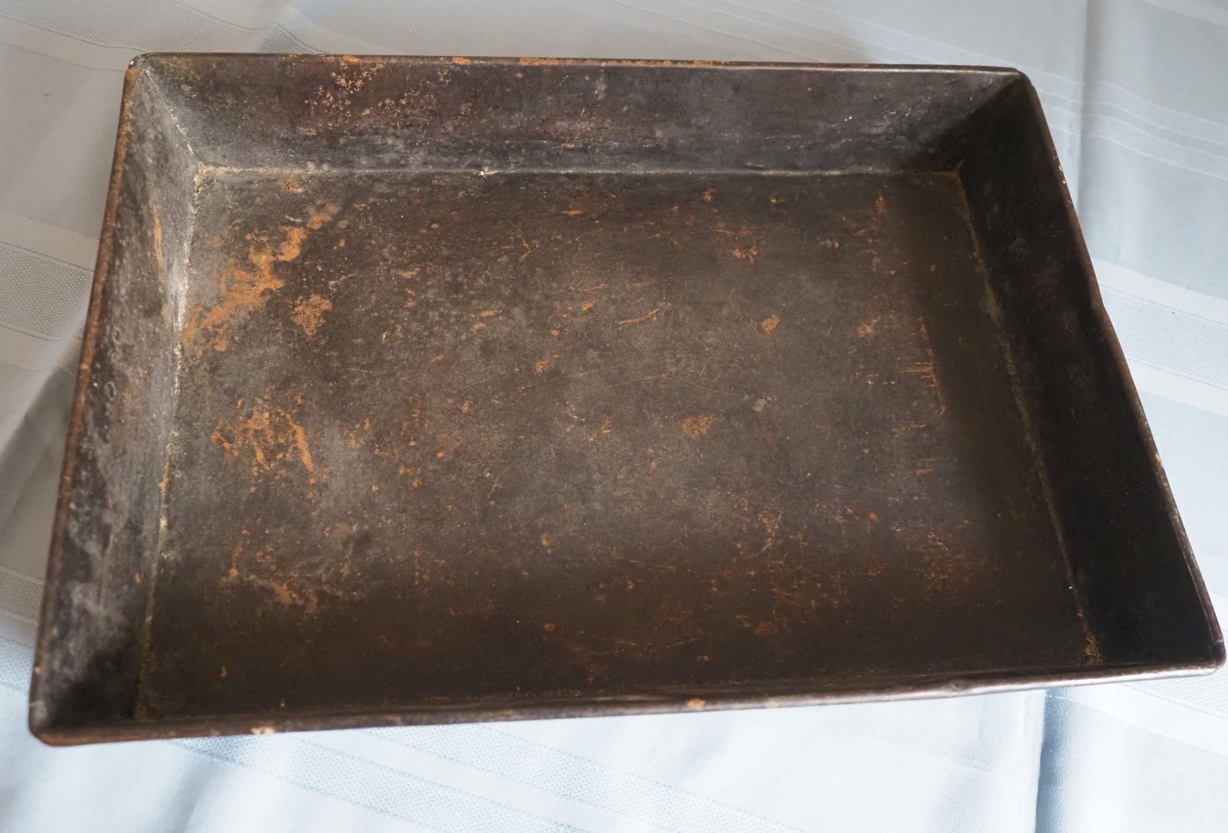 Metal tray, painted black with wire handles, sloped sides
