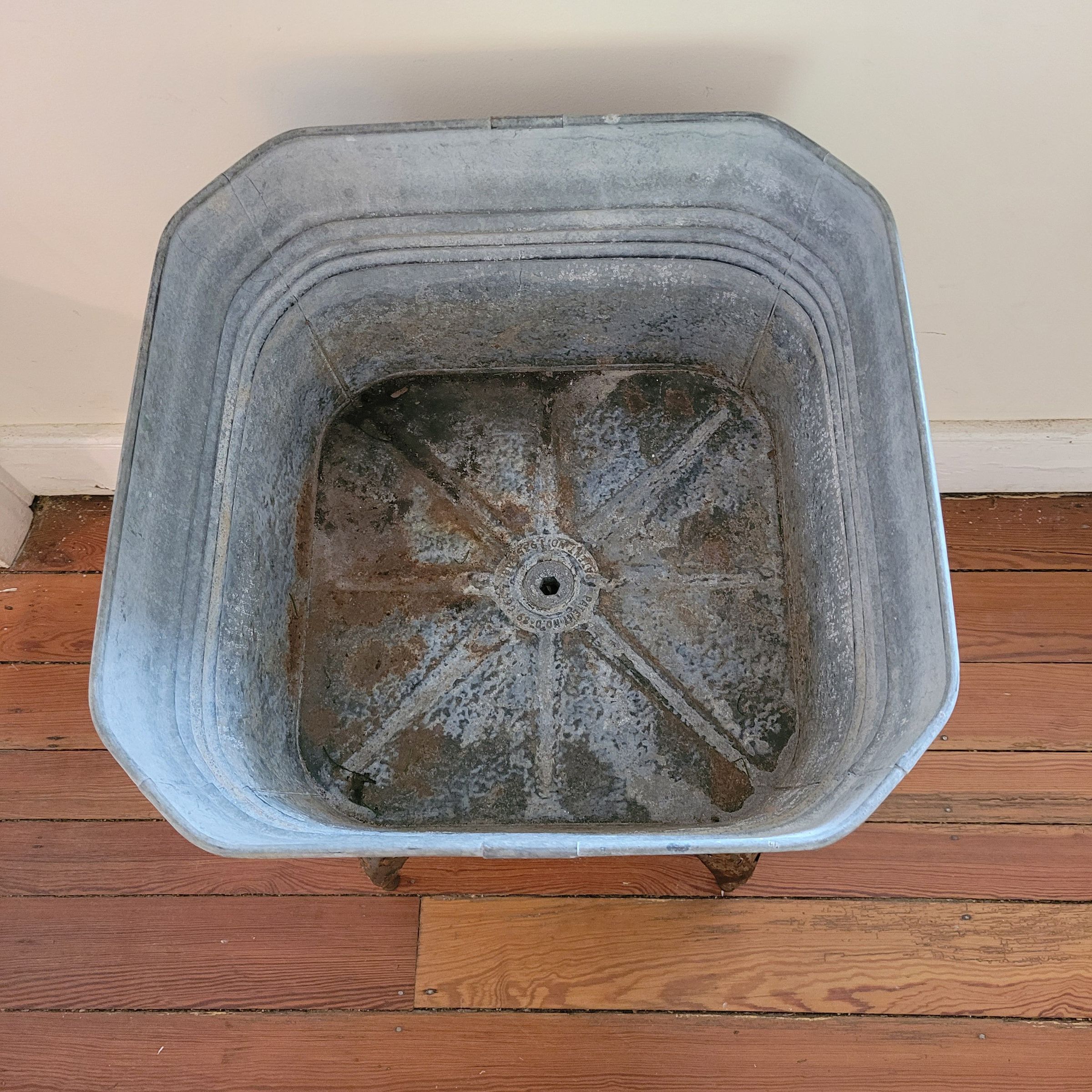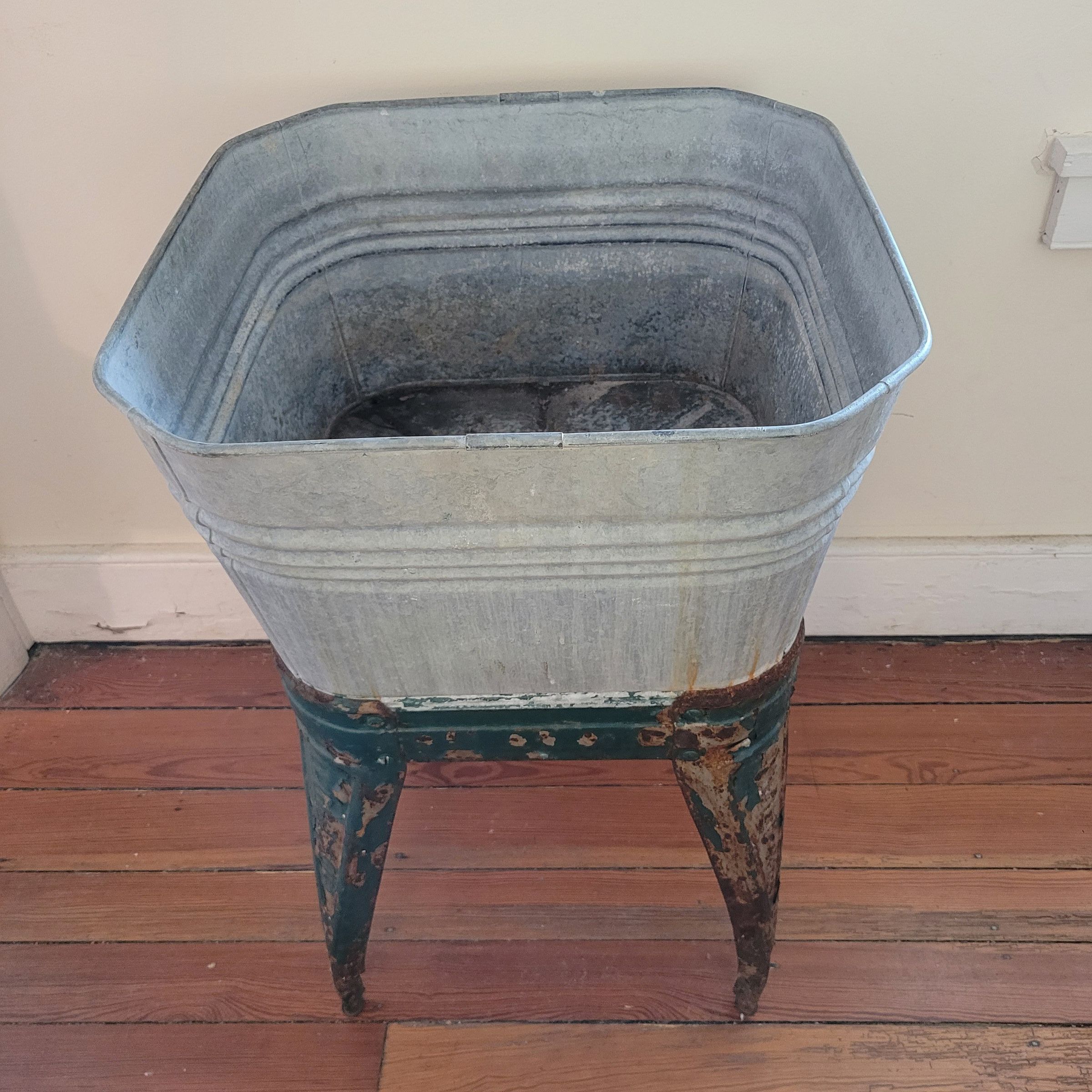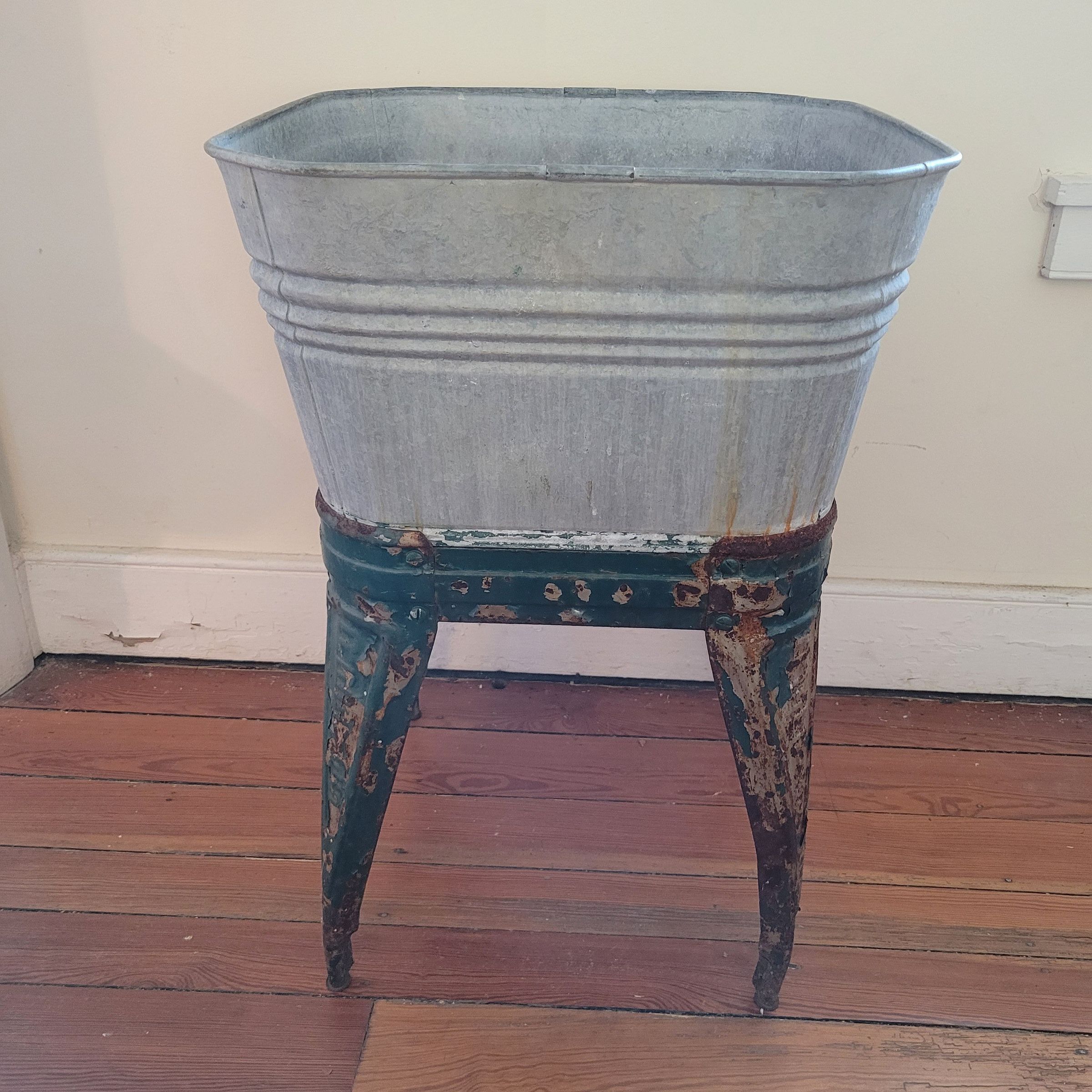 Square galvanized wash tub on stand with 4 legs, painted greenInscription/Signature/Marks