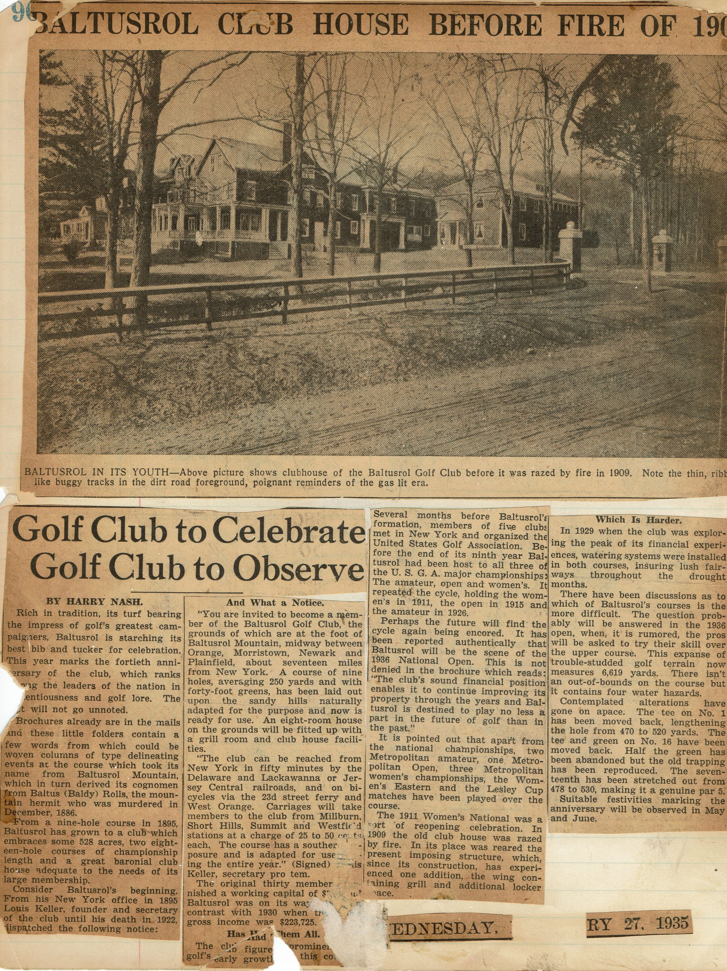 Newspaper clipping of a 1935article about Baltusrol Golf Club on it's 40th anniversary from Herman Wehrle's scrapbook.Acquisition