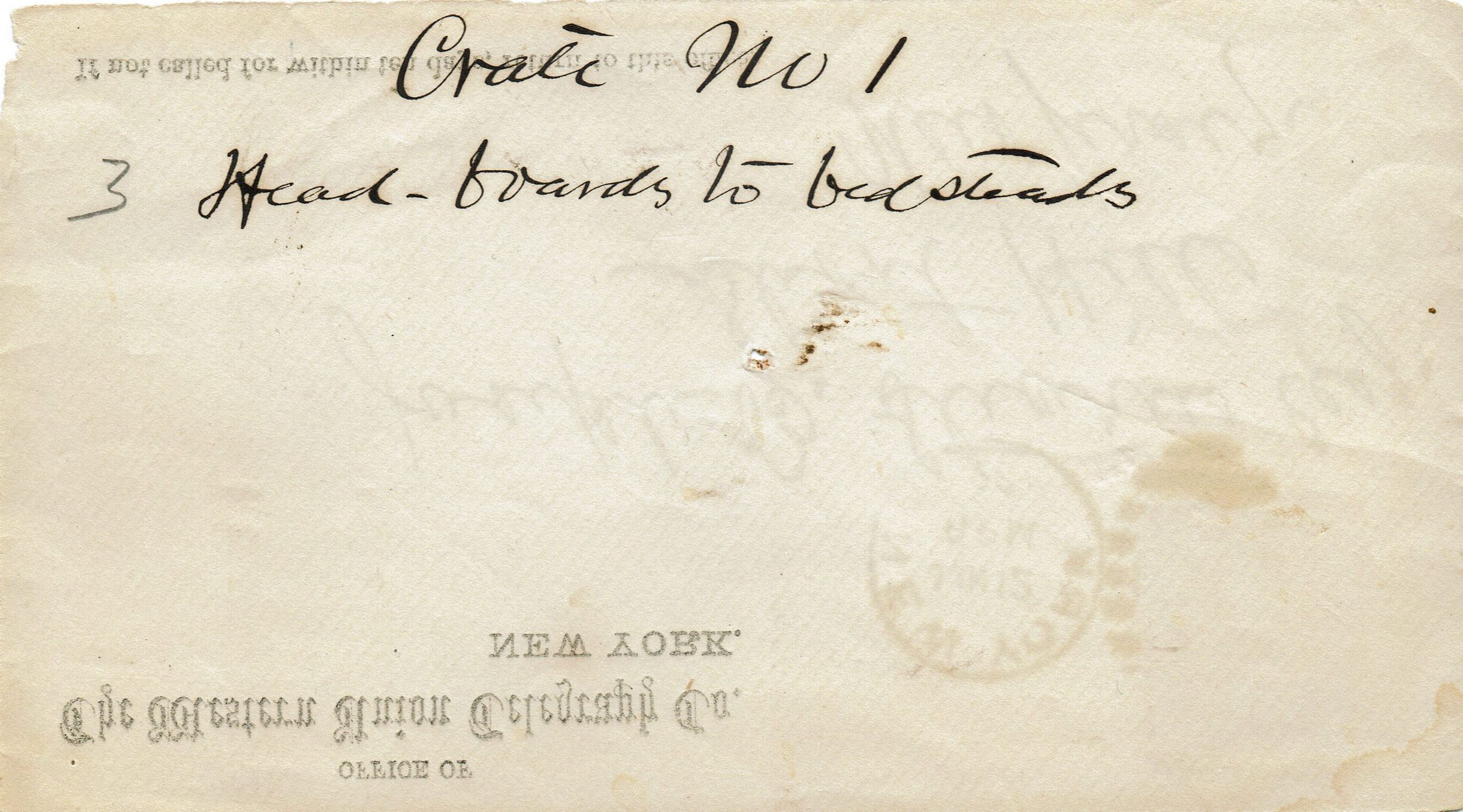 Envelope from the Office of the Western Union Telegraph Company to Joseph B. Stearns, Esq., Short Hills, New Jersey postmarked New York, June 12, 1896, 6:00 pm. Verso of envelope reads Crate No. 1, 3 Head-Boards to bedstands.Acquisition