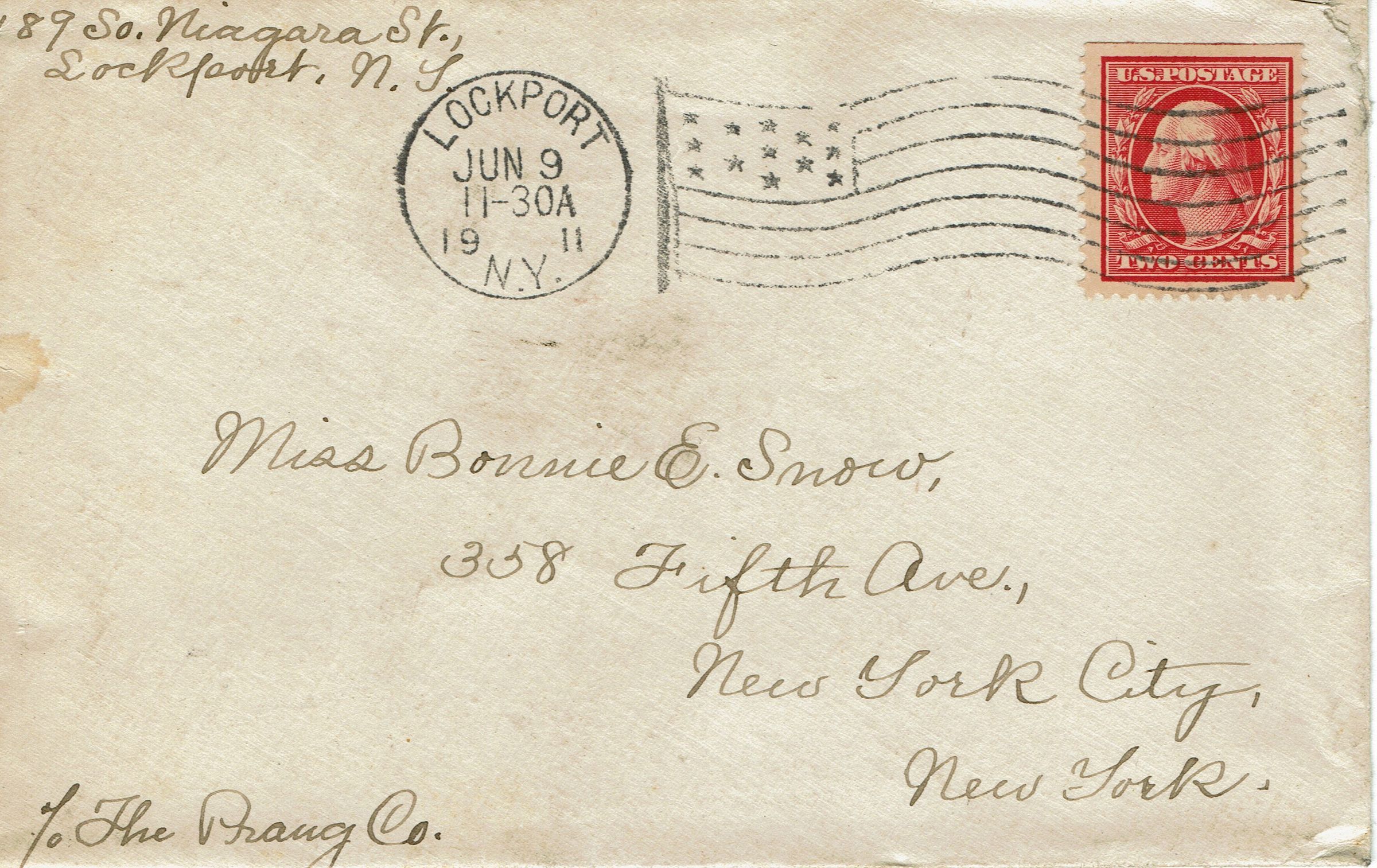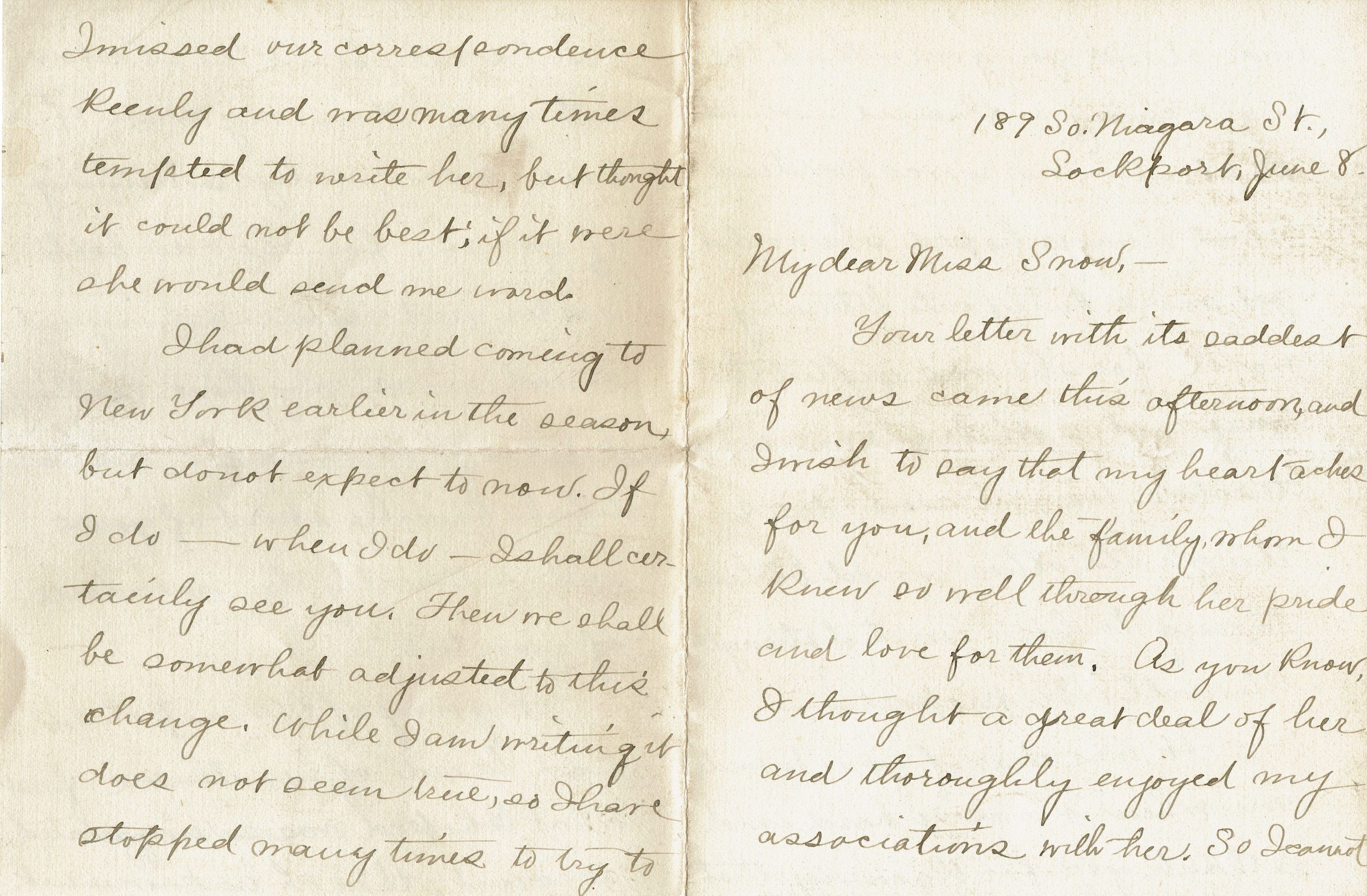 Unsigned 4-page handwritten letter to Bonnie Snow expressing sympathy over the death of the artist's sister, Winnie. Envelope is postmarked Lockport, NY, June 9, 1911.Collection