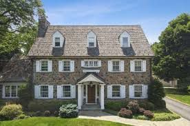 Like 79 Minnisink Road, this house also has a roof of Dutch Colonial origin. This one is a gambrel with a bell-cast eave and slate covering. Exterior finish: clapboard. One of the original Hartshorn Estate Inc. Houses. Style: Colonial Revival. Architect: William Renwick.