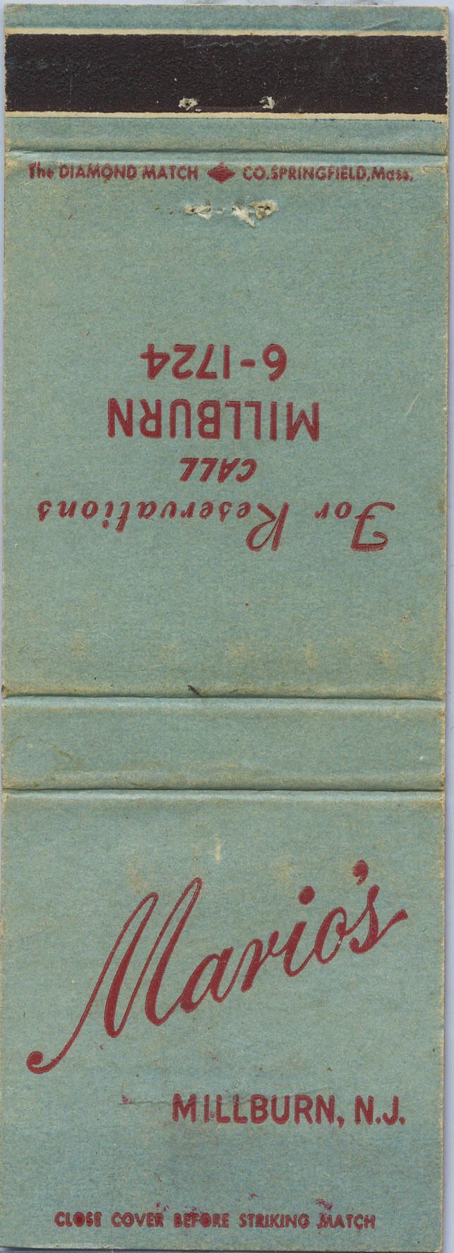 Light green Mario's matchbook cover. The outside of the matchbook cover notes: "Mario's; Millburn, N.J." and "For reservations call MILLBURN 6-1724. The red and white inside of the cover is printed: "Luncheon; Dinner; Supper; Dinner Served All Day; Sundays & Holidays." The cover shows overall wear, edgewear, bumped corners, and areas of light fading.Acquisition