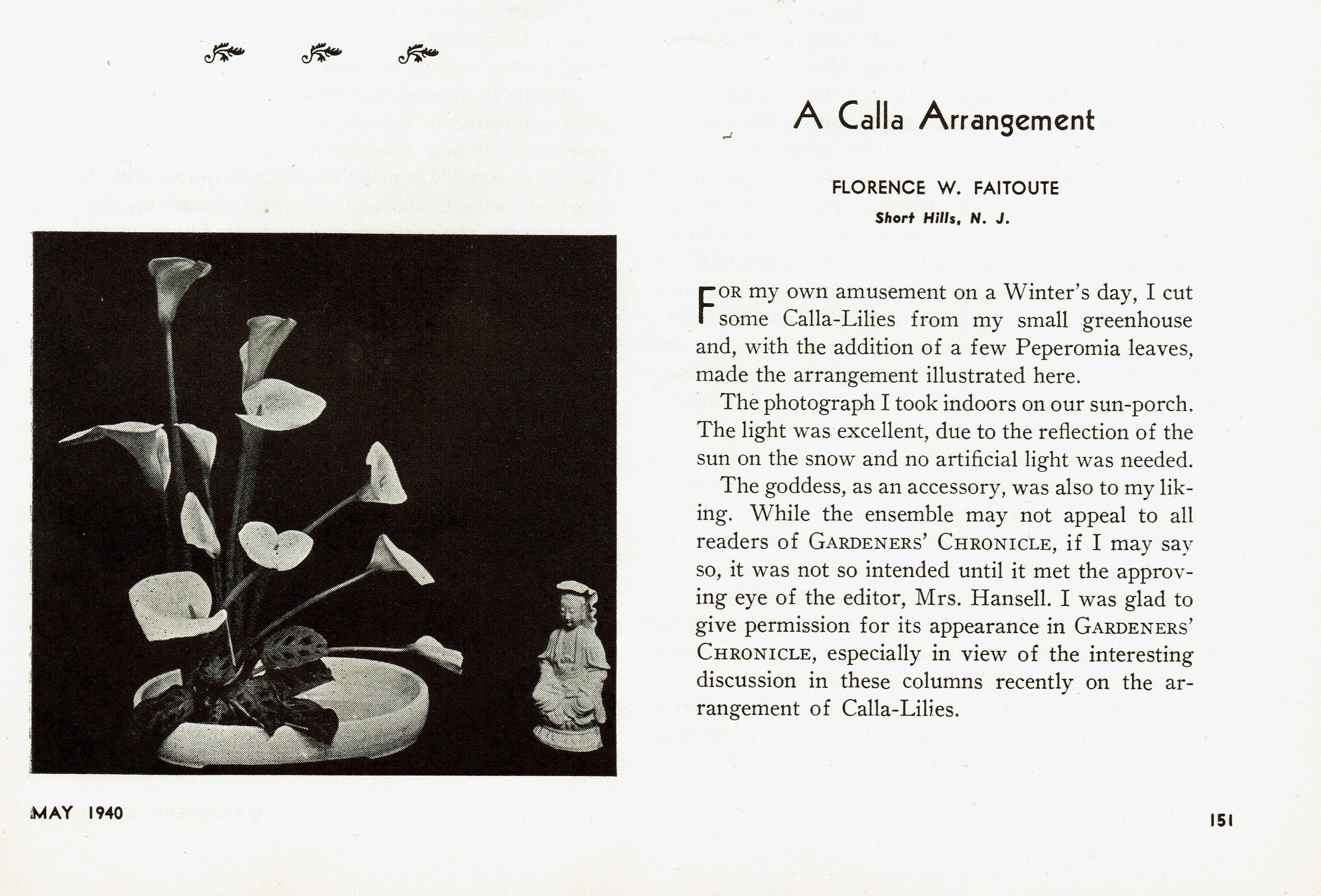 "A Calla Arrangement," Florence W. Fairoute, Short Hills, NJ in Gardners' Chronicle of America, 44, 5 (May, 1940), p. 151. Short article and B&W photograph.Acquisition