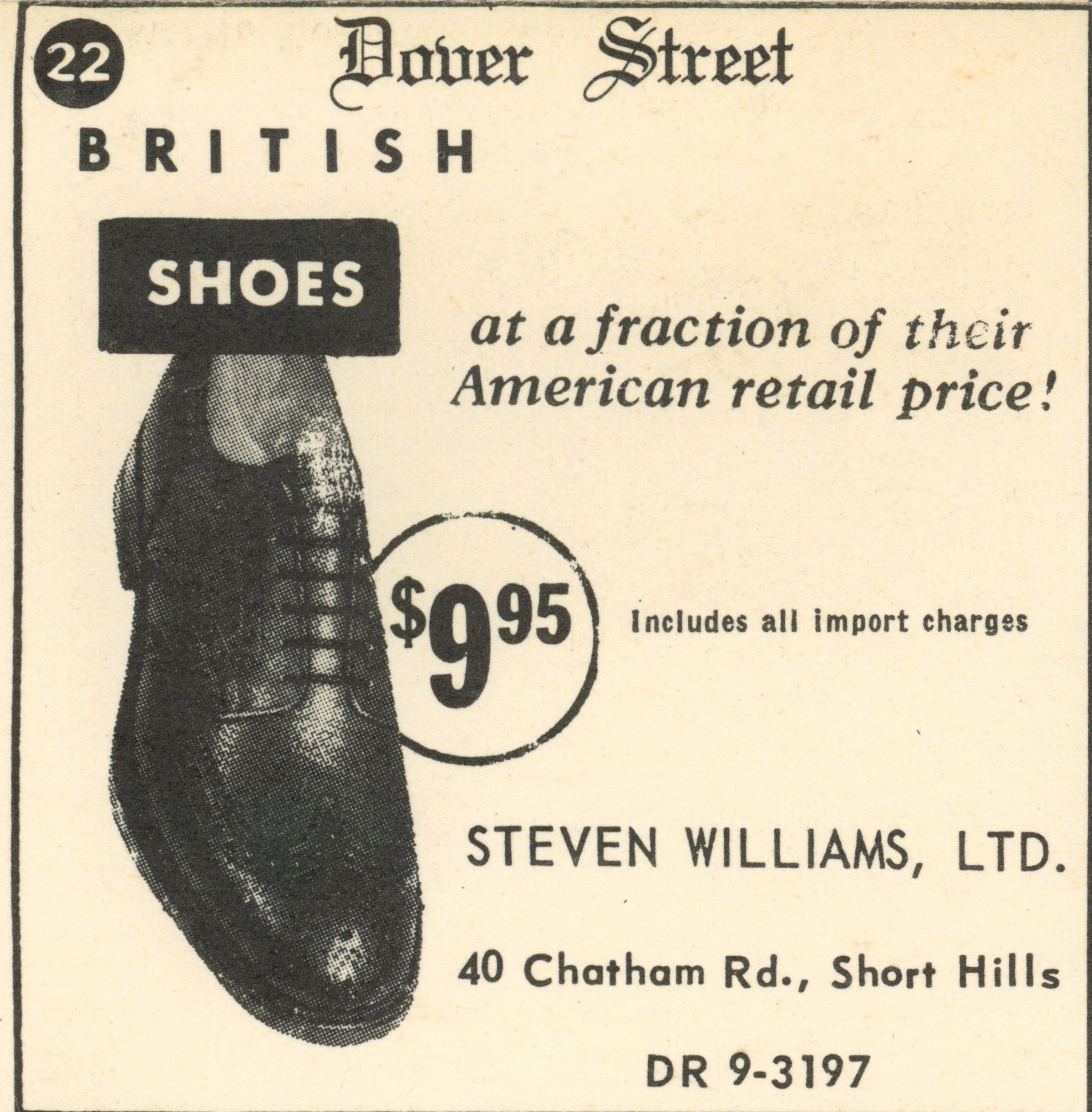 Shoes: Advertisement for Steven Williams, Ltd. Shoes, 40 Chatham Road, Short Hills, 1955