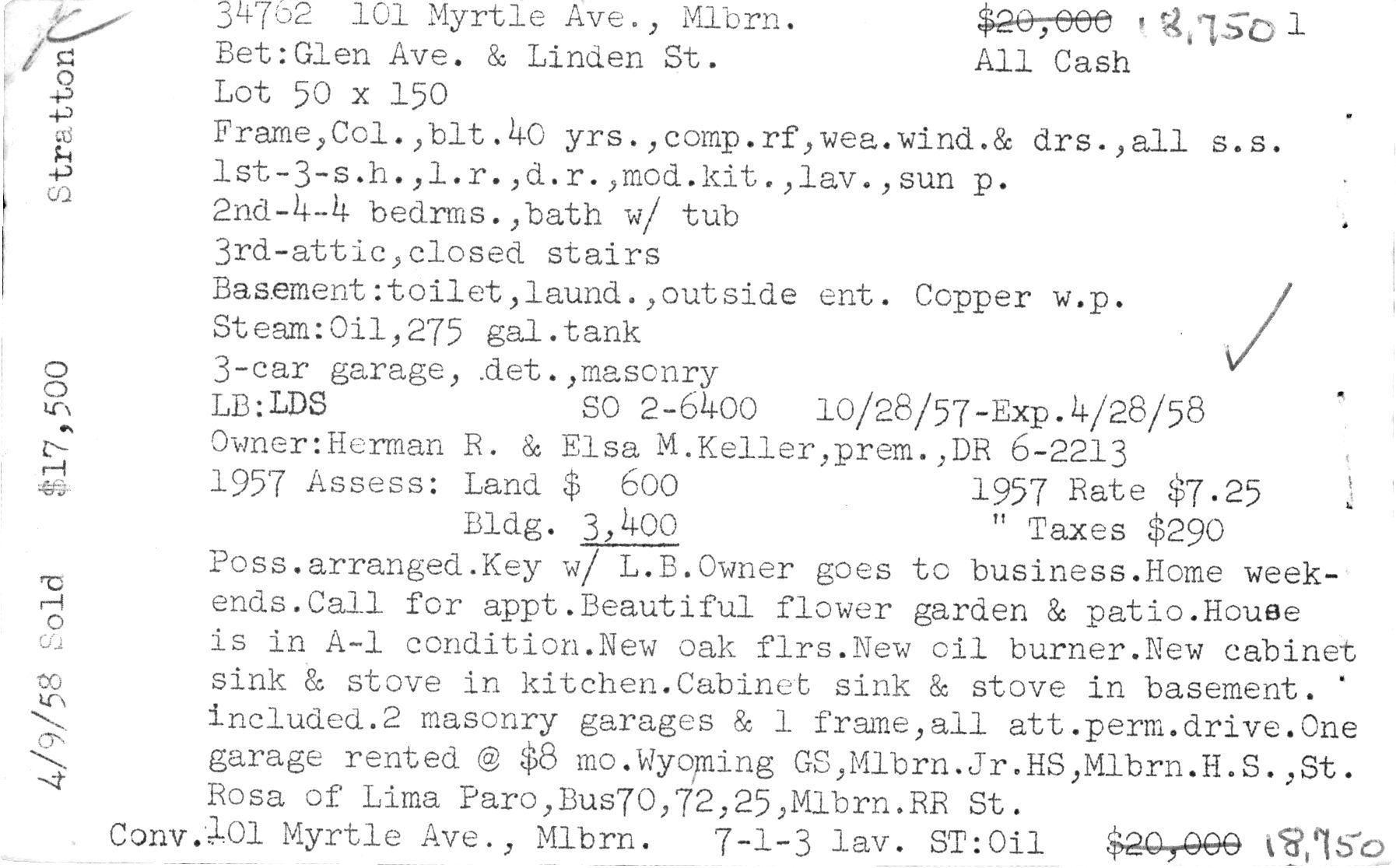 Information from the 1978 David Gibson Historic Sites Survey. The house was built in c. 1908. Previous owners were: Mrs. Jane Bucherman (1908), Mary Bucherman (1912), Herman and Elsa Keller (1953), Matthew and Stella Rowe (1958).