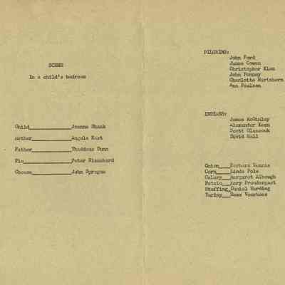 Program from the Short Hills Country Day School 4th Grade Play, "A Thanksgiving Nightmare," November 22, 1961. 4 pp. Cast members were: Joanne Shaak, Angela Kast, Thaddeus Dunn, Peter Blanchard, John Sprague, John Ford, James Cowan, Christopher Klem, John Penny, Charlotte Hartshorn, Ann Pualsen, James McGinley, Alexander Kean, Scott Glascock, David Hall, Barbara Dennis, Linda Pole, Margaret Albaugh, Mary Prendergast, Daniel Harding, Ross Voorhees. Stage Managers: Robert Fitzwilliam and James Ozias.Acquisition