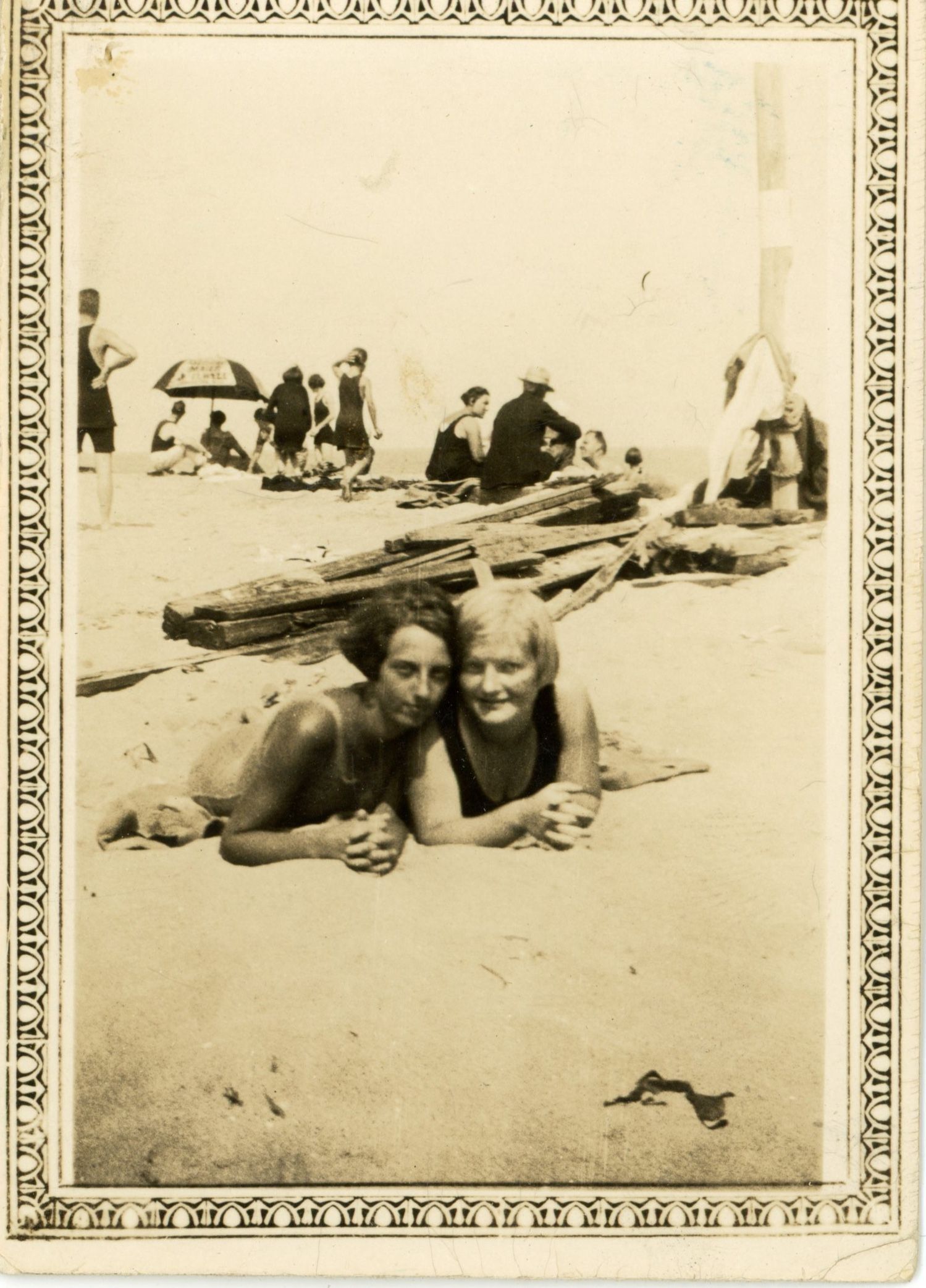 Photograph of Genevieve Silance and Audrey Mangold at the Beach from the Mangold photo scrapbook.Photograph Details