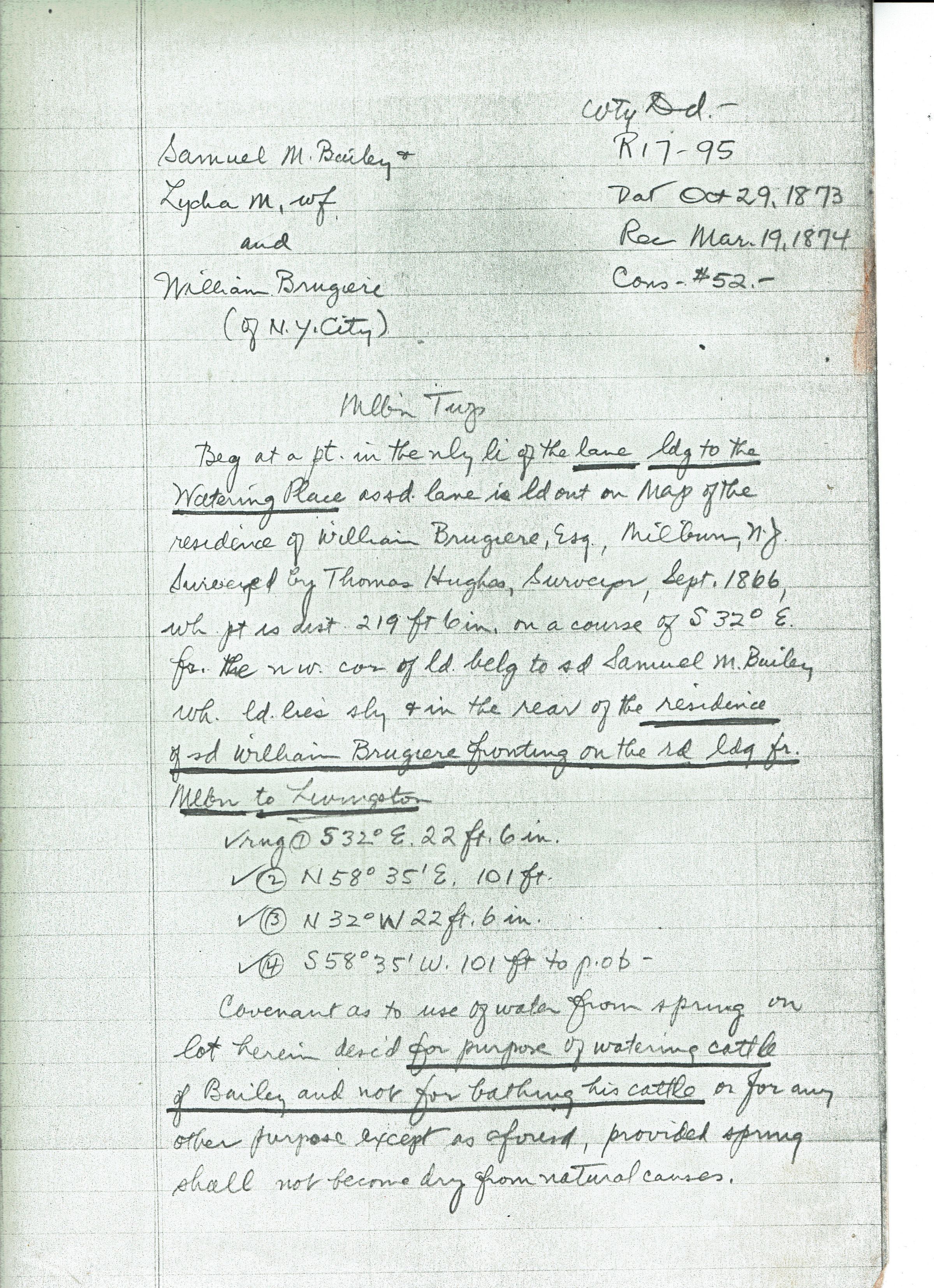 Fidelity Union Trust Documents on Property at 125 Farley Road: 1923 letter to Fred Carver about Fidelity's search on property at Short Hills, 1923 Fidelity Union Trust Company Title report on 125 Farley Road (Hopkins property), Copy of Old Short Hills Road and Farley Road section of the 1906 Atlas, Handwritten notes on 1866 arrangement between Samuel and Lydia Bailey and William Brugieres for water rights, Handwritten notes on 1891 arrangement, conveying the same rights to James R. Pitcher.Acquisition