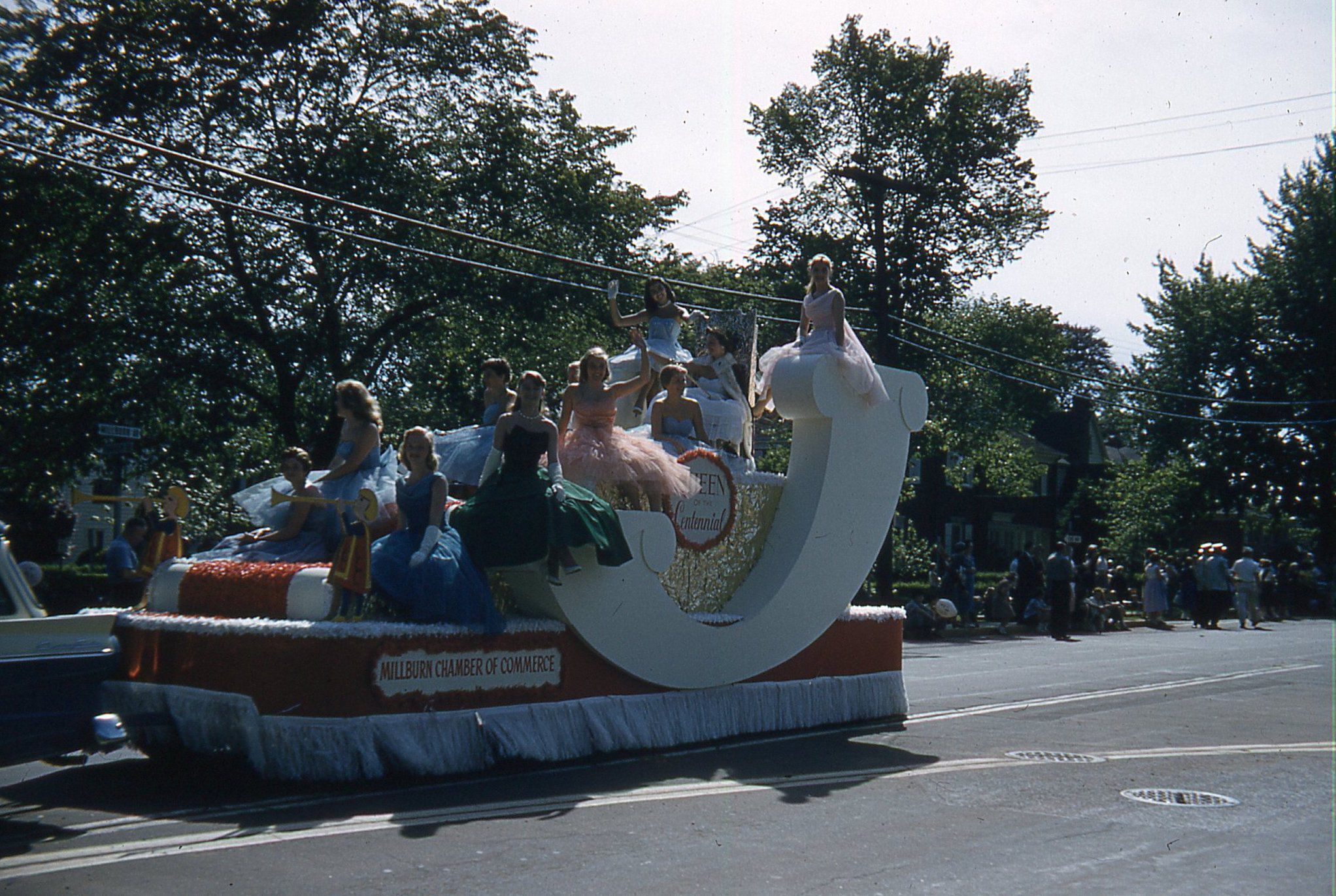 Photographs of the Queen of the Centennial Float at the 1957 Millburn Centennial Parade. The Queen of the Centennial was chosen via a contest sponsored by the Millburn Chamber of Commerce, which also sponsored the float. Barbara Bridges was crowned queen. Irene Bufo and Rachel Levin were awarded maids of honor. Members of her majesty's court, who appeared on the float were: Shirley Ann Busler, Linda Cargan, Nancy Davis, Catherine Foley, Marjorie Kemp, Barbara Schauler, Elaine Schneider and Marilyn Sommer.Photograph Details