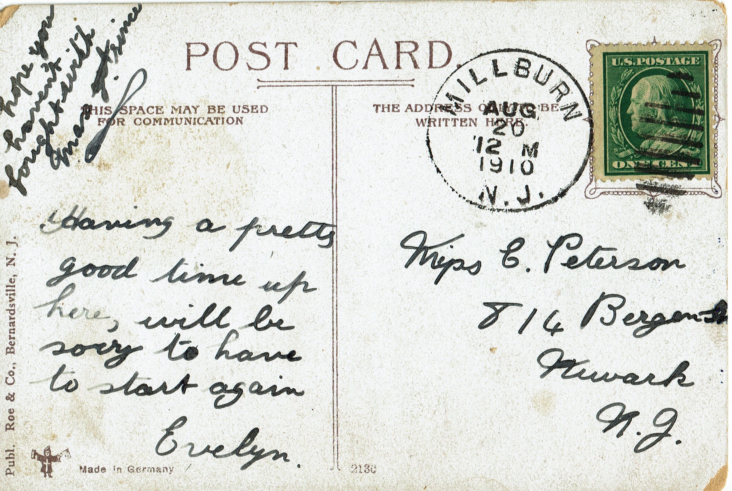 Color Postcard "On the Road to Short Hills, Millburn, NJ" showing a man in a horse drawn buggy on a dirt road with children walking nearby. Postmarked Millburn, August 20, 1910. Message on the reverse from Evelyn to Miss E. Peterson, 814 Bergen Street, Newark, NJ.Collection
