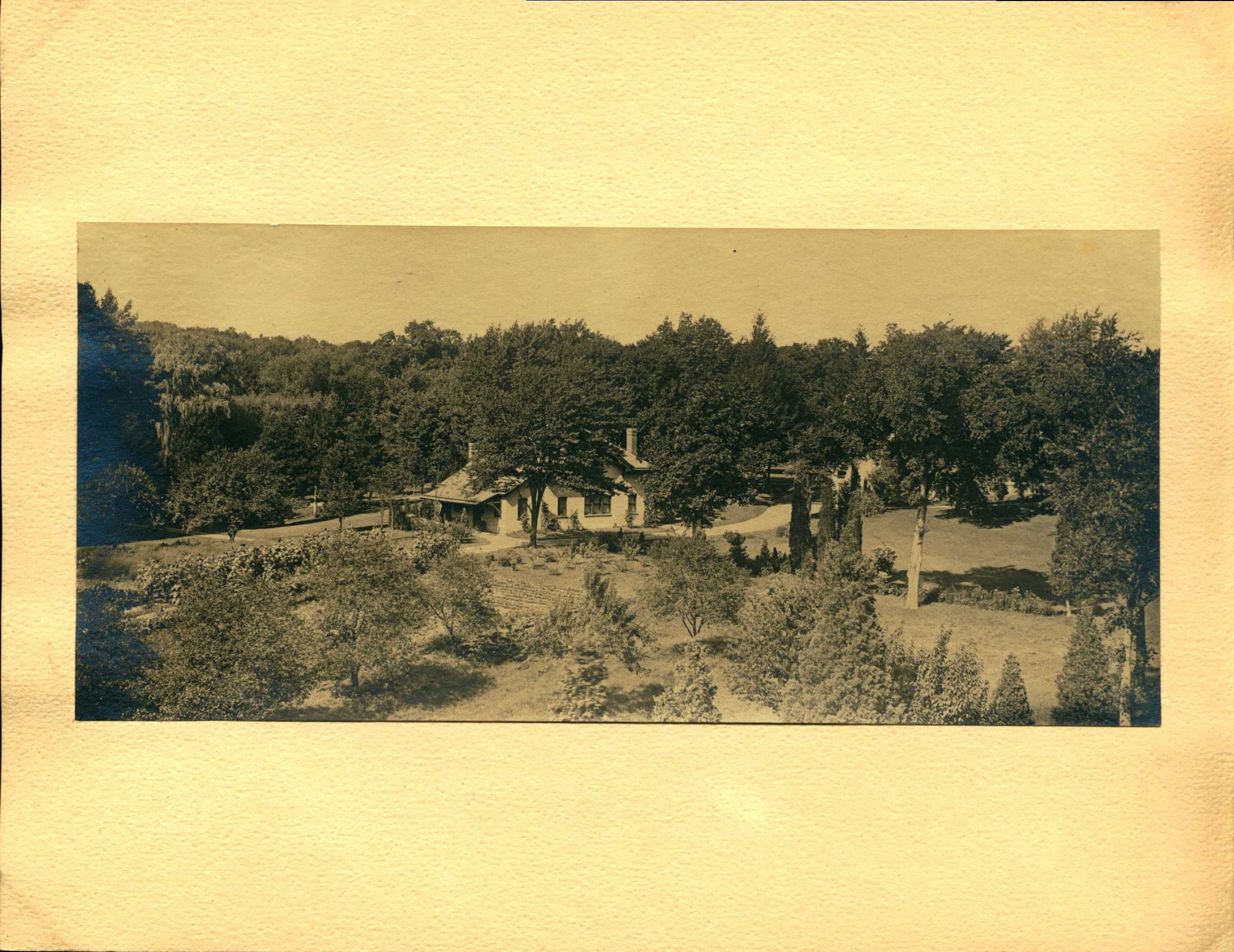 Image #8. Photograph of house at the end of a garden path as viewed from a distance. Note the dirt roads. Photograph emphasizes the relationship between the house and the landscape. Hartshorn oversaw the development of his properties to ensure that each house had a proper vista. The photograph emphasizes his ideal.Collection