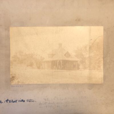 Copy of Short Hills Train Station Photograph from the Hartshorn Family collection. Handwritten notes on the matte say, "Built and maintained by Stewart Hartshorn in 1879. By 1880, he had two trains a day coming through the station."Collection