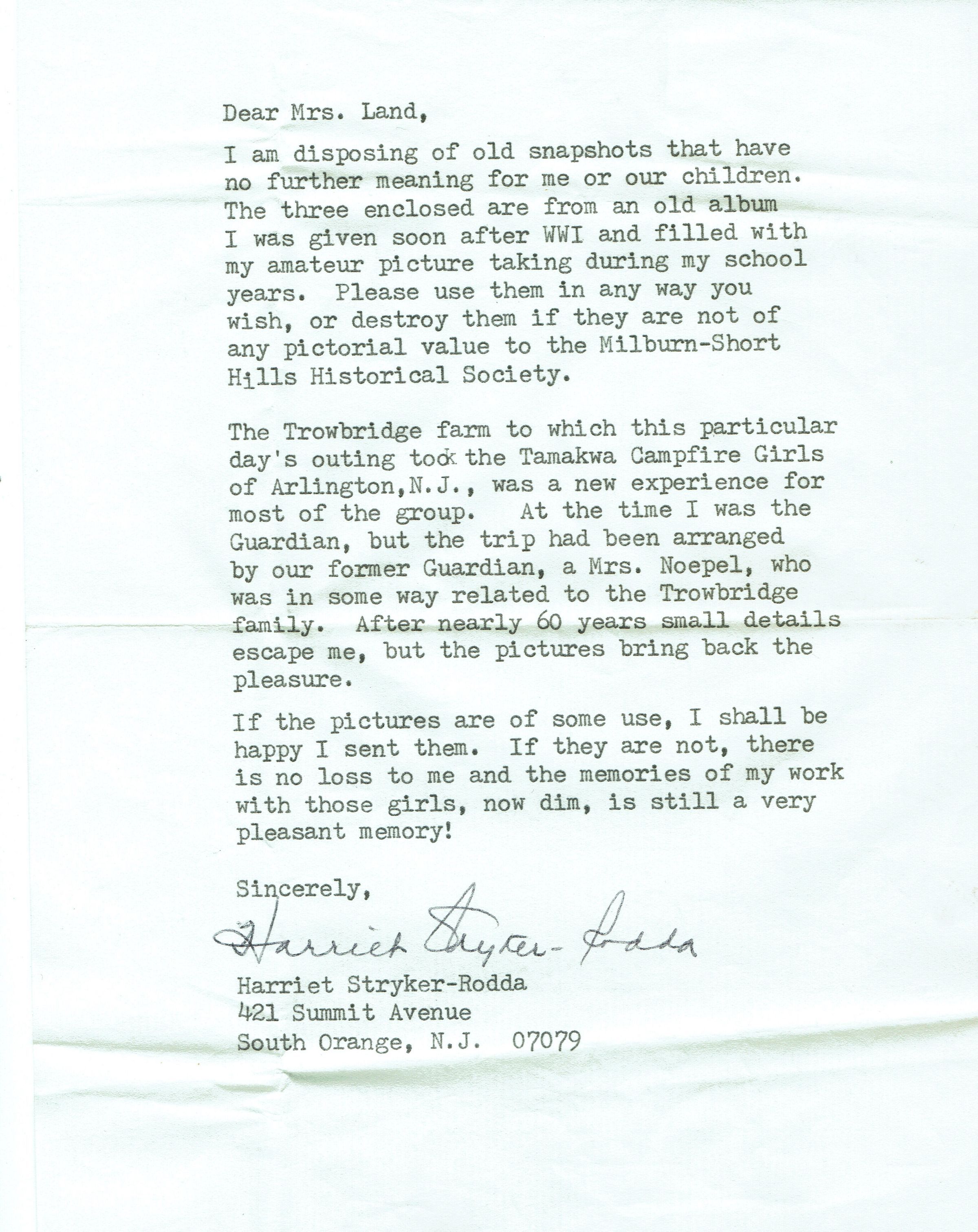 Letter from Harriet Stryker-Rodda to Fran Land regarding photographs she was donating to the Millburn-Short Hills Historical Society. The photographs show the Trowbridge farm and Tamakwa Campfire Girls from Arlington, N.J. Letter and photographs were in an envelope sent to Owen Lampe from William Ross in 1982.Acquisition