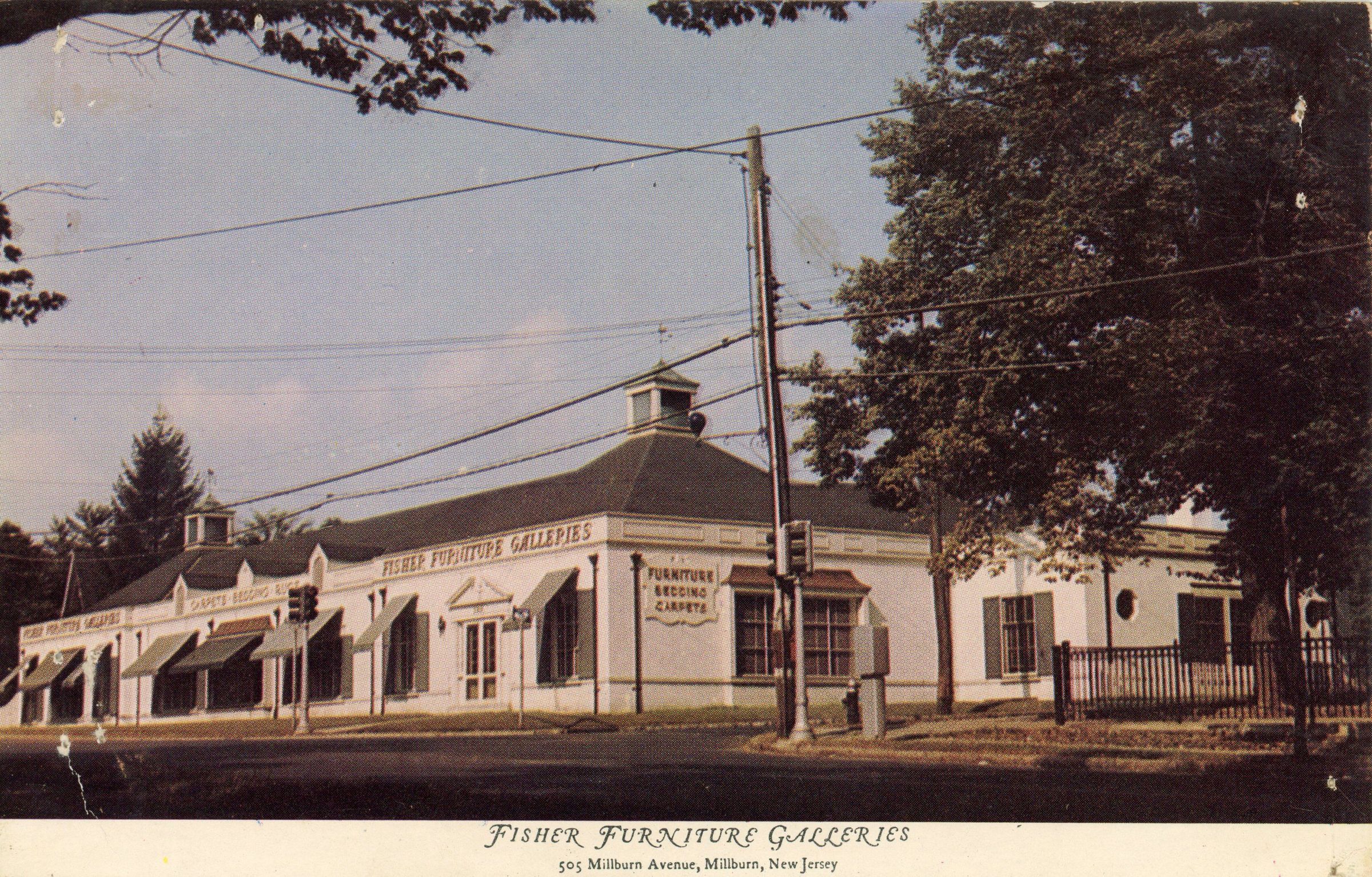 Advertising postcard for Fisher Furniture Galleries, 505 Millburn Avenue, Millburn New Jersey. Fisher Furniture was established in 1940 by Edwin George Fisher (49 Nottingham Road) and remained in business until 1960.Acquisition