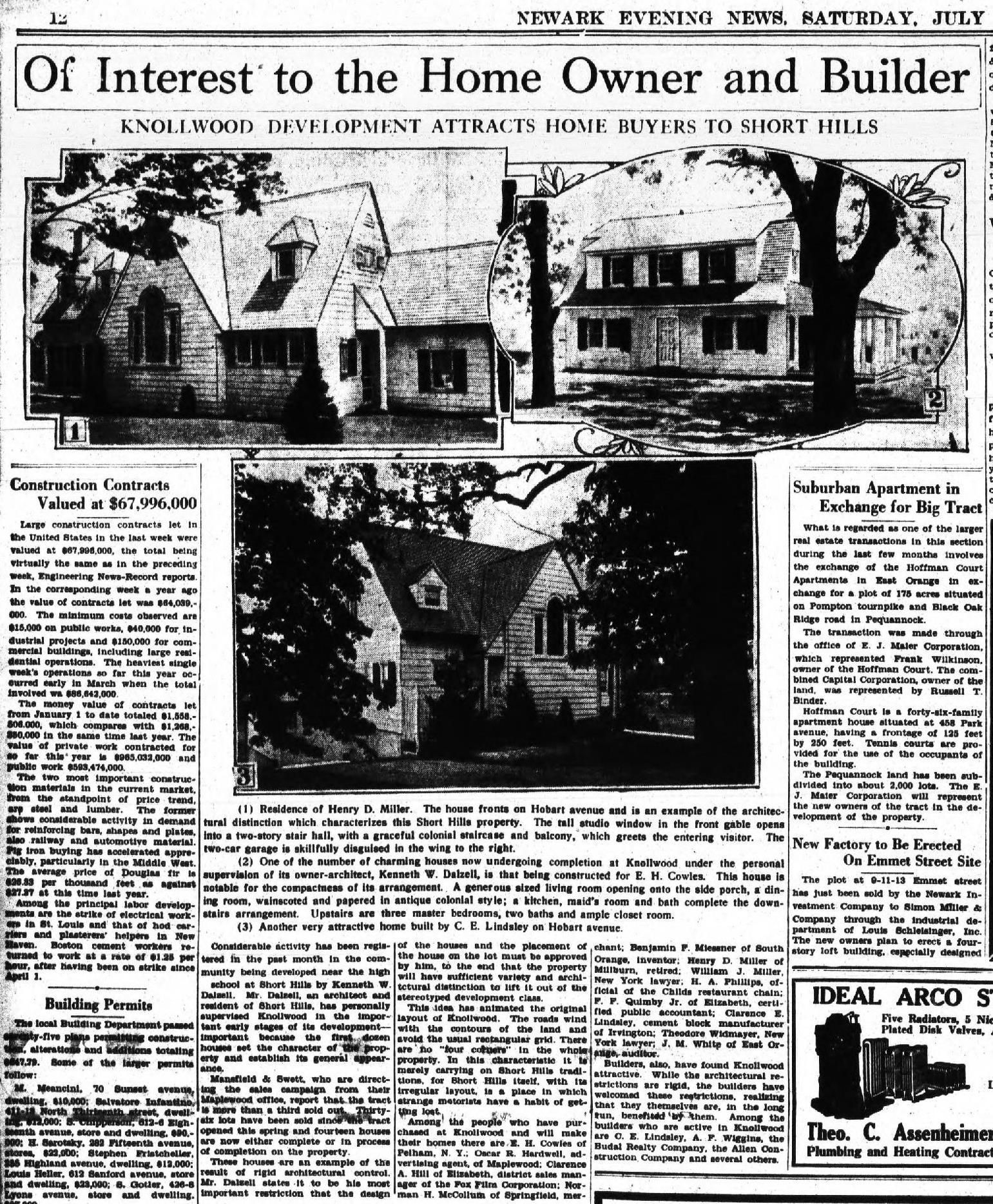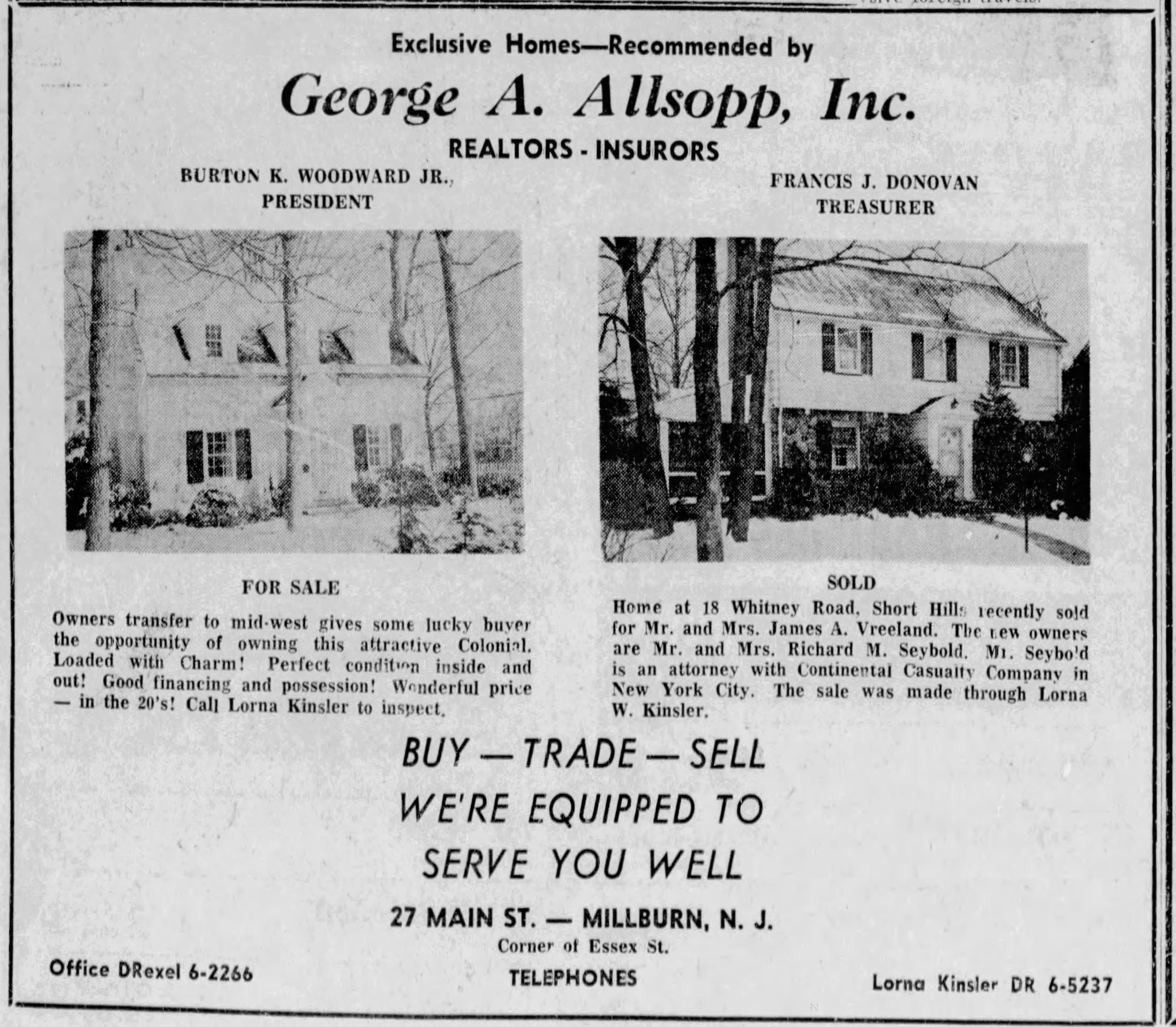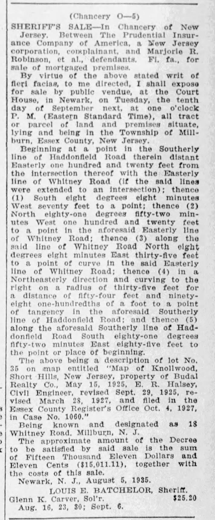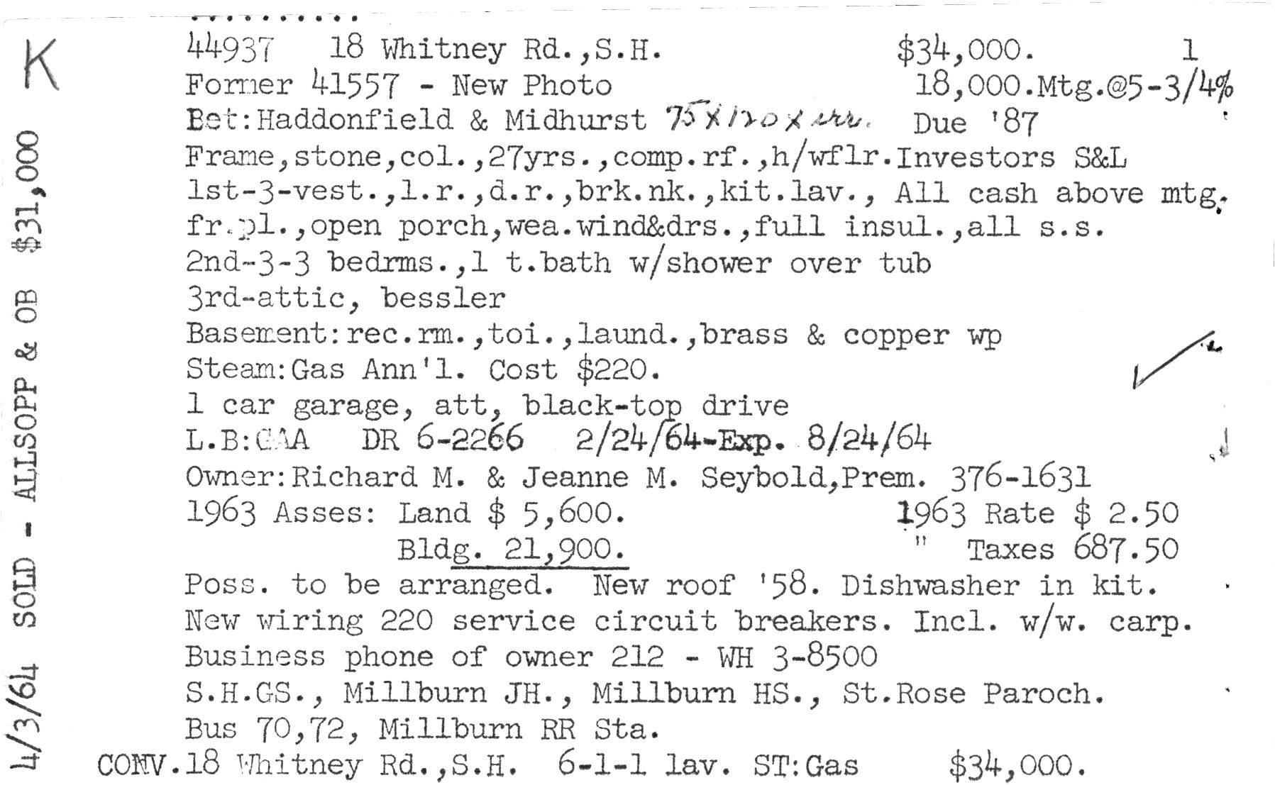 Real Estate record for 18 Whitney Road, Short Hills sold by Allsopp Realtor in April 1964 and additional research. The house was part of the Knollwood Development, which was started in 1926 by Kenneth Dalzell. According to this listing, the house is 27 years old, which would put its construction at 1937. The lot is depicted as #35 on the 1925 Map of Knollwood and was listed in a September 1935 Sheriff's Sale. Previous owners included Mr. and Mrs. George B. Graeff (1937-1952) Mr. and Mrs. Robert Henderson (1953-c. 1958), Mr. and Mrs. James Vreeland (1958-1962), Mr. and Mrs. Richard Seybold (1962) and Jane Coryell Riedel (1987).