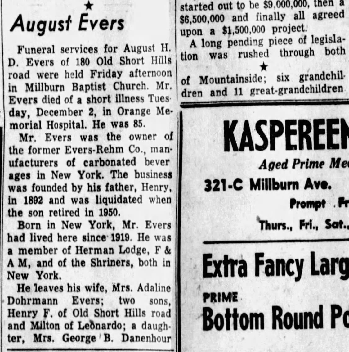 House was at one time owned by August H. D. Evers (c. 1873-1958), owner of the Evers Rehm Company, manufacturers of carbonated beverages in New York. It was liquidated in 1950. August Evers moved to Short Hills in 1919 and is on the 1928 Robinson Map.